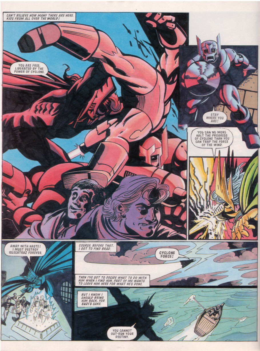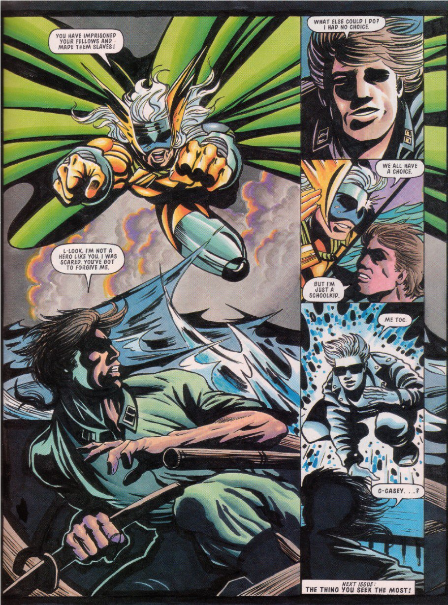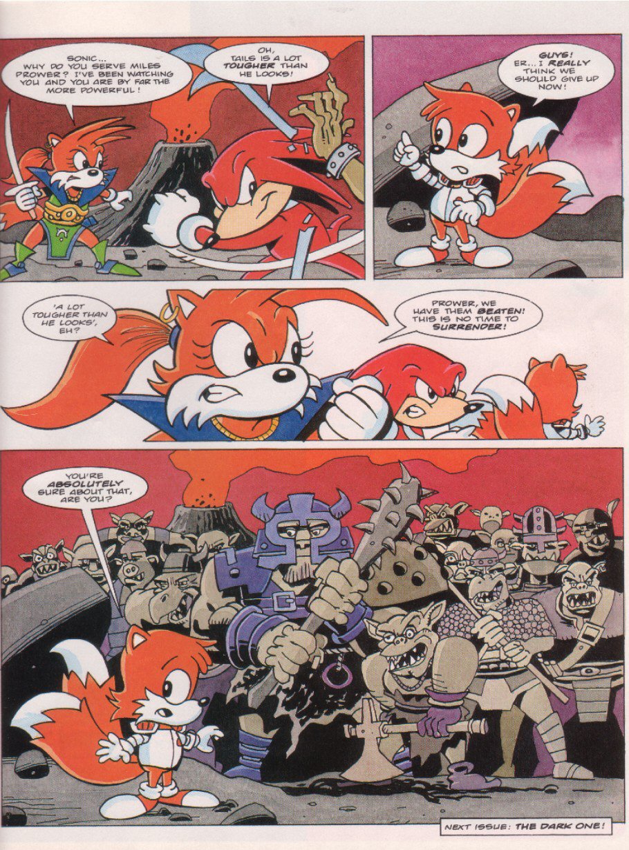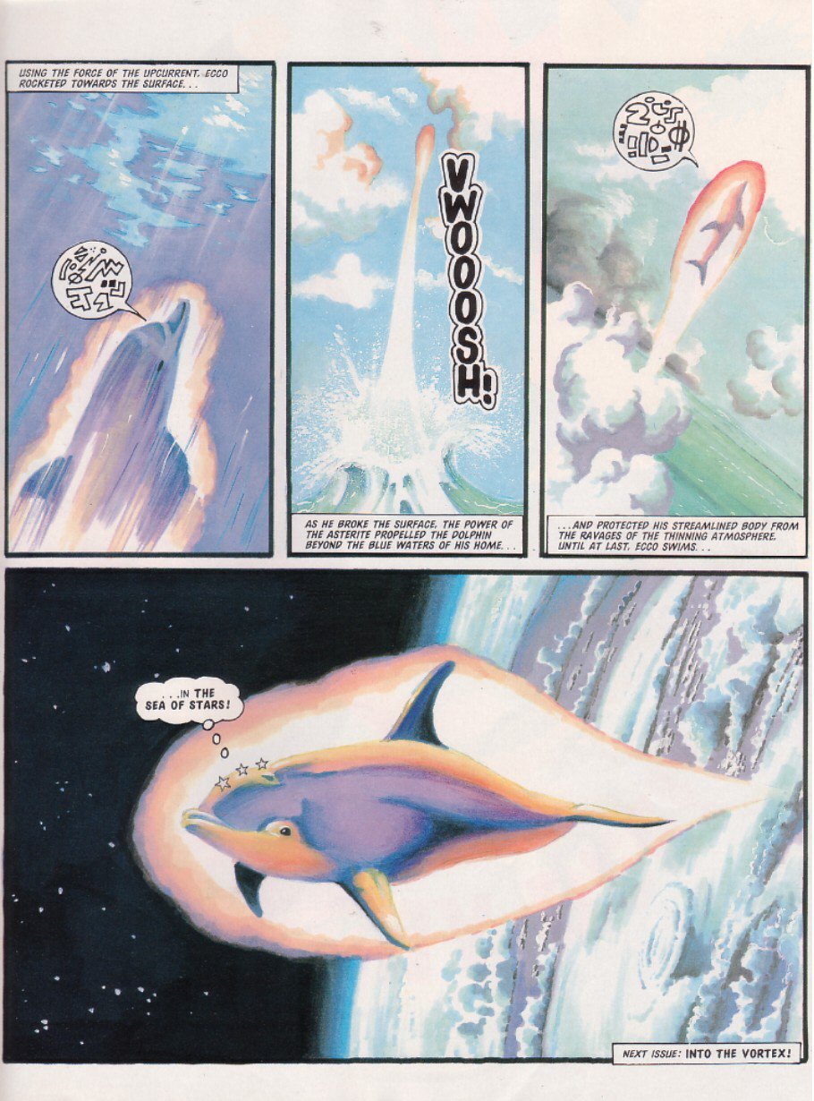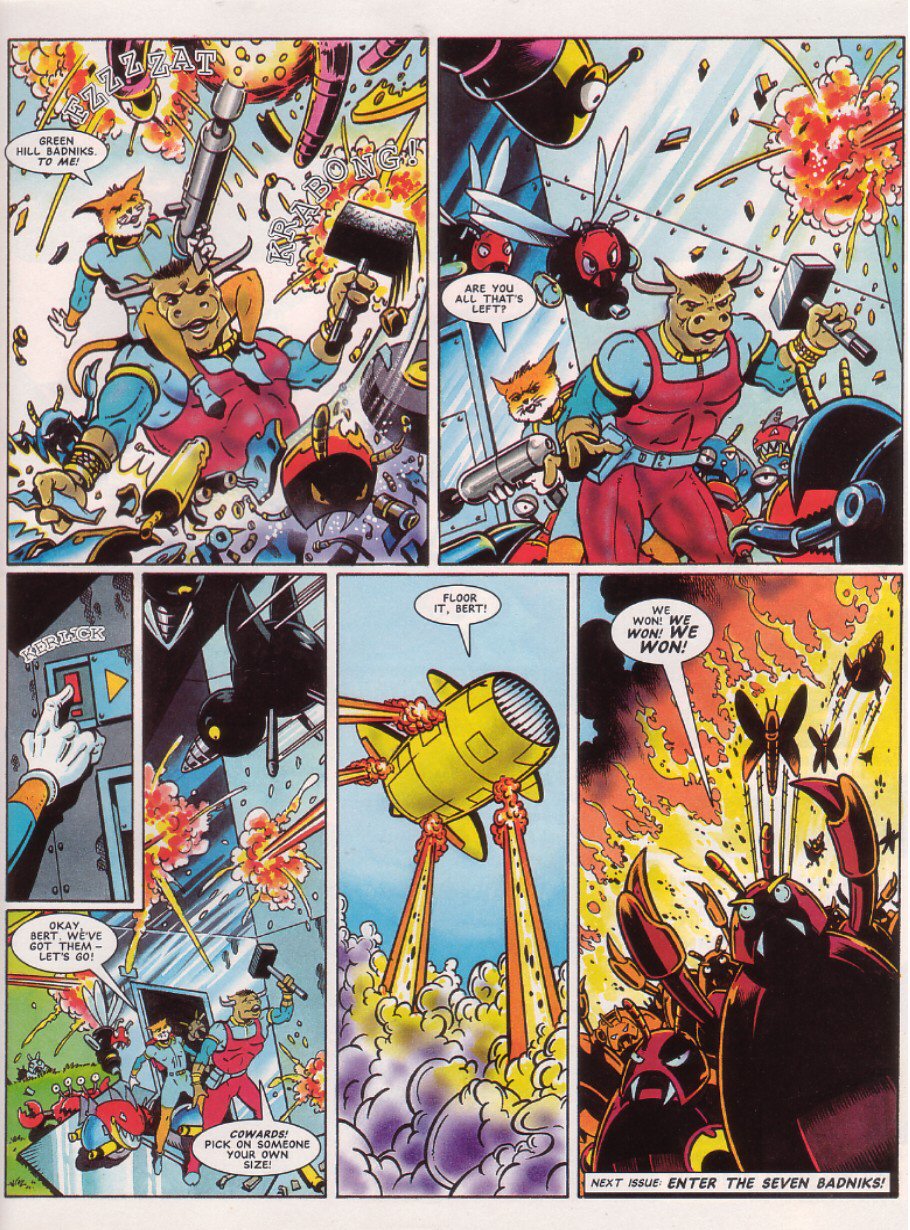 EXIT Sparkster! There are a few theories as to why he didn't show up again: one story is that Konami just refused to give StC the rights for further stories, even though a sequel had been almost completed. Another is that Fleetway never had the rights to begin with, and just assumed they did because hey, Sparkster's on the Mega Drive. This led Konami to go "What do you think you're playing at? ... Fine, you can finish things up, but that's IT, you got that?"Either way, the Rocket Knight was done.