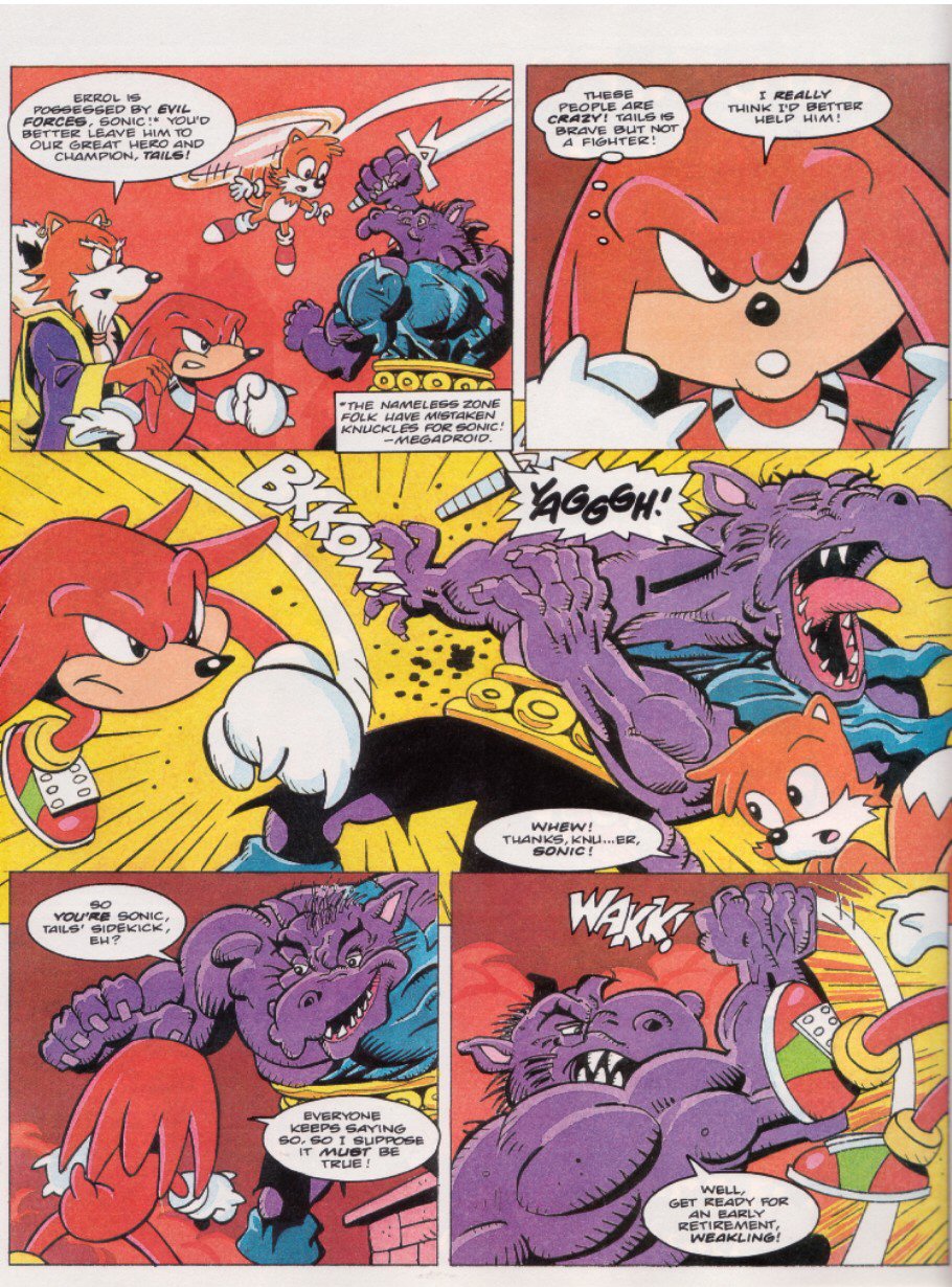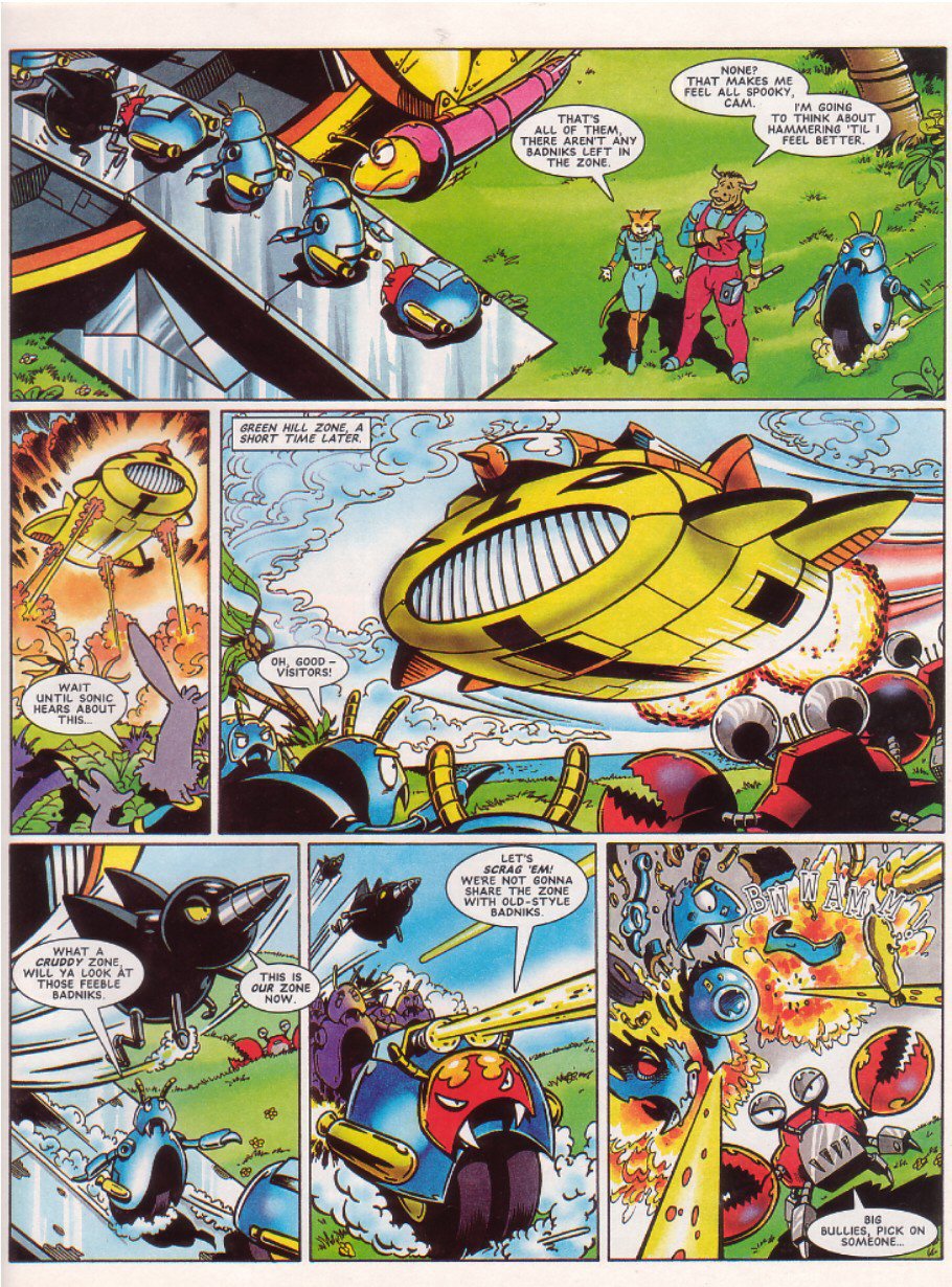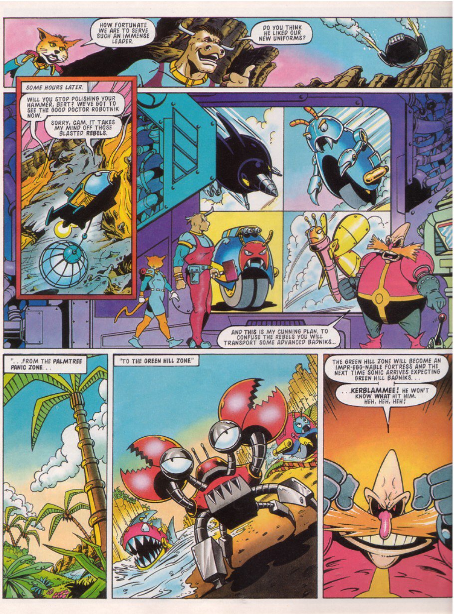 >>12354000>Move the Palmtree Panic badniks to Green Hill to take on Sonic>Evacuate the Green Hill badniks when the Palmtree badniks exert their authority>Super-power the Green Hill badniks >have them fight the Palmtree badniks>relocate the surrendered Palmtree badniks back to Palmtree Panic>leave the new Super badniks in Green Hill>watch Sonic casually destroy the Palmtree badniks>wonder out loud whether the whole point of this story should have been Sonic fighting the Super badniks>the editor of the comic agrees before confirming that we are absolutely done with this messThis entire, stupid 4-part story