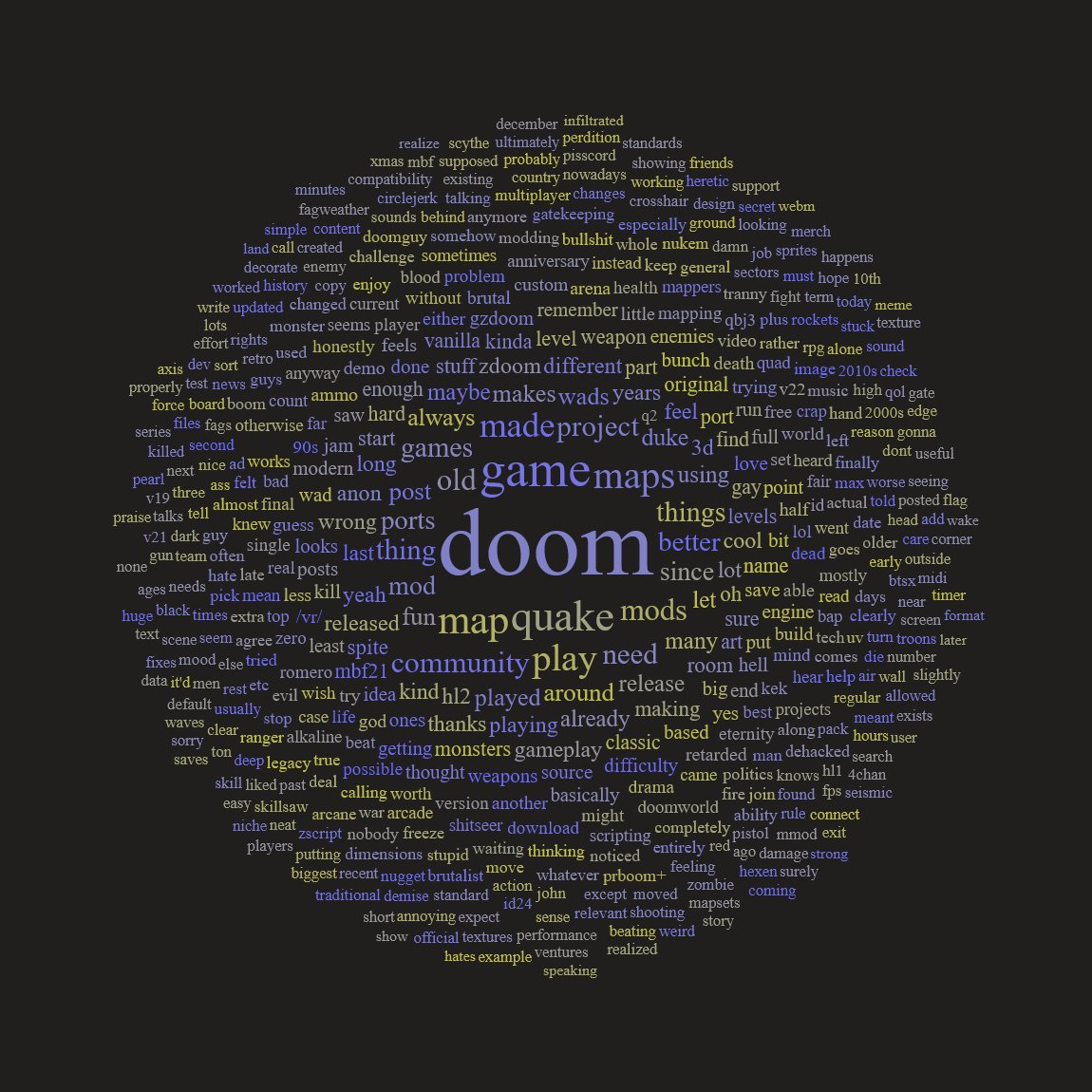 Why so many purists are against limit removing maps, or even shit like free look, jumping, crosshair, etc. Like if they had the tech back then the Doom devs would've implemented those things, how's being able to only aim horizontally better than being able to look up and down and freely aim wherever you want? It literally makes no sense, the former is worse and just a relic of tech being limited at the timeAlso, the obsession with ''purism'' has led to an ocean of maps that all look and play like each other, they might as well be procedurally generated at this point