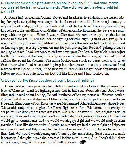 >>12387918The problem with Bruce Lee discussions is that very few people actually know much about him, or the transitional era of martial arts he existed in. While you're correct that he has plenty of exaggerated myths about him, it goes too far in the other direction too. Lots of people unfairly diminish him, saying he was "just an actor and nothing more," or overly obsess over the stuff like the Gene LeBell incident. That wasn't a huge deal between them - they became friends, and Gene even taught Bruce some grappling. Gene himself didn't like people making it into a bigger deal than it was, and spoke well of Bruce.>Zero recorded fights, the only "fight" he had that was ever witnessed by anyoneHe did have confirmed fights, you can even see a newspaper talking about his high school boxing match. We know he fought some people and won, it's just he didn't fight any high level competition, and didn't compete in general. He didn't have a fighting career and those fights are mostly just interesting trivia.Annoyingly, Bruce Lee gets talked about as a hypothetical fighter more than what he actually was, a martial arts teacher and actor. He was actually a great teacher for the time, and helped push the American martial arts community towards more realistic training. In the first year of American kickboxing, he was already training a student (Larry Hartsell) for a tournament, and Joe Lewis, the first kickboxing champ, trained with him in 1968-1969. Hell, the knockout in the first kickboxing match even came from something Joe had worked on with Bruce. Now, even as a teacher he gets exaggerated (father of MMA, etc.), but it's not a stretch to call him the "unofficial grandfather of American kickboxing".In terms of contributing to modern combat sports, Lee did more than people think. It would be better if people gave credit for the things he actually did rather than arguing endlessly over his fighting ability. His actual legacy looks good enough on its own.
