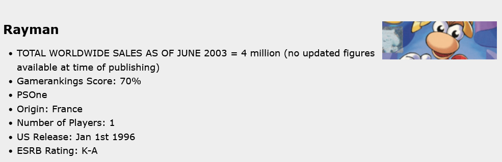 Did you know Rayman sold 4 million copies across all consoles? 4 million! No one ever talks about it. It sold more than Croc, or Banjo Kazooie, or RE3. Everyone remembers those games, but not Rayman. Rayman was just kinda "there".