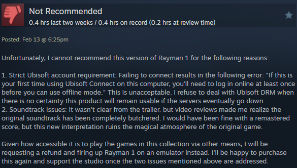>you can get Rayman Forever, the PC pack that contains most of the DOS-exclusive content, for $1.49 on GOG right now.I know it's not Rayman Collector (the full edition) but the OST is mostly intact here so WHAT WHERE THEY THINKING