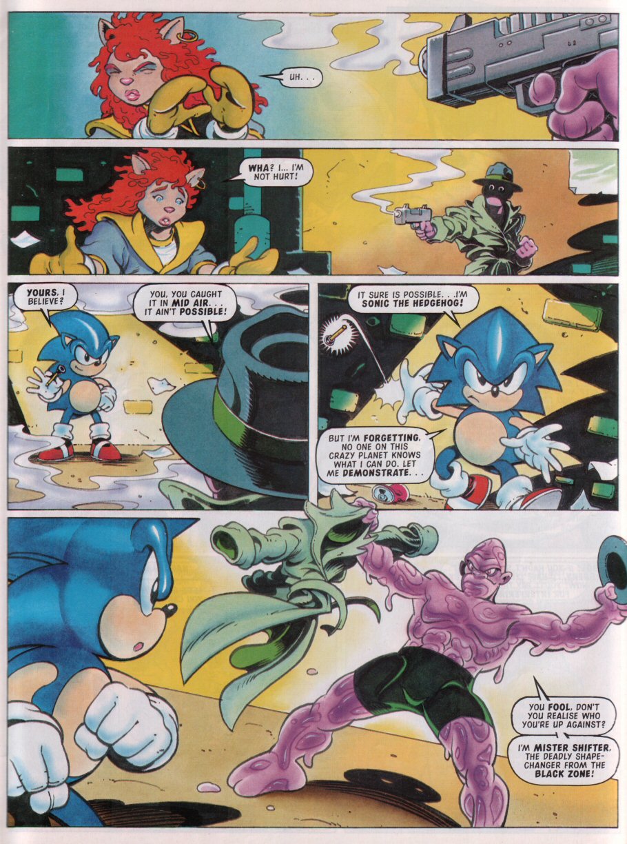 Instead of a bullet, Sonic catches a dart. And not even a poison dart, it's the kinda shit that kids play with.