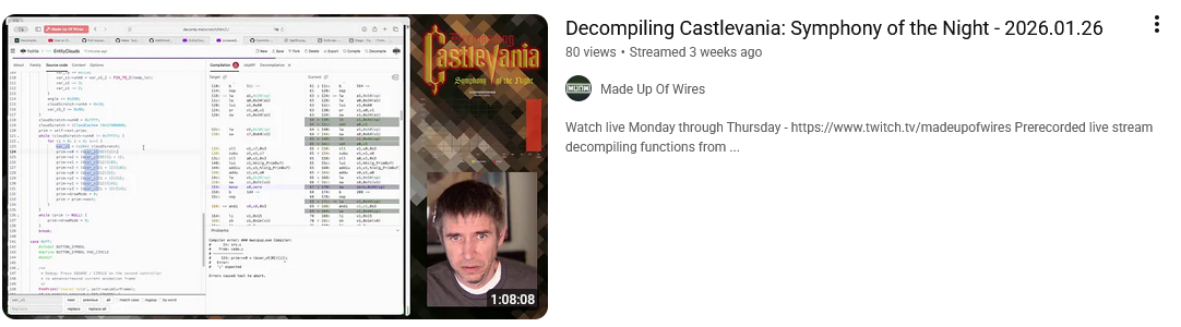 https://www.youtube.com/watch?v=OlbwJ9hgmaEThere's a guy who streams his SotN decomp sessions, and it looks like a huge pain in the ass a a lot of work. How is it that Sotn is stuck at like 35%, and these other projects are Fatal Frame or SH are near 100?