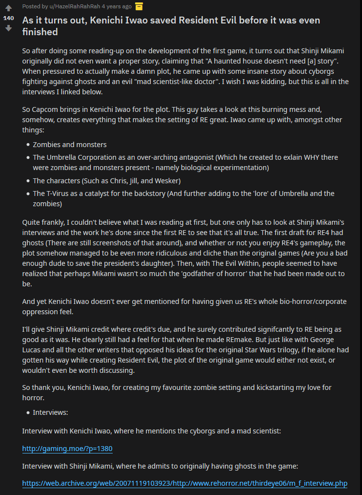 >>12412147Iwao was the actual director of the original, not Mikami. Mikami is the one dude who wanted the game to be about cyborgs fighting ghosts and removed Iwao from development at the last stage.Mikami didn't even feel he directed the original game; most staff went to Iwao or Fujiwara during development instead of him. He wasn't even supposed to work on the remake--he only joined development after getting drunk at a 2001 New Year's party and agreeing to do it.