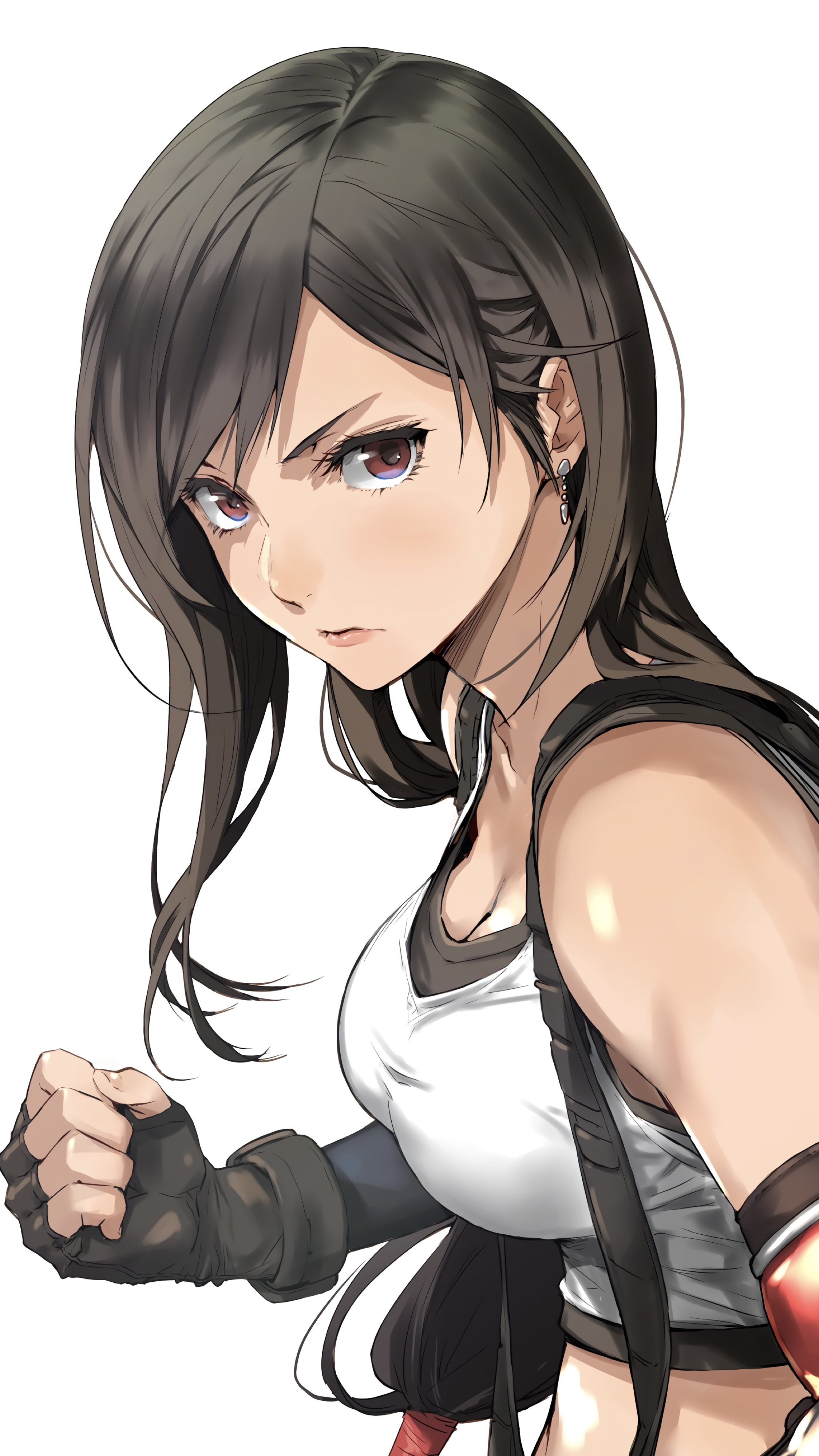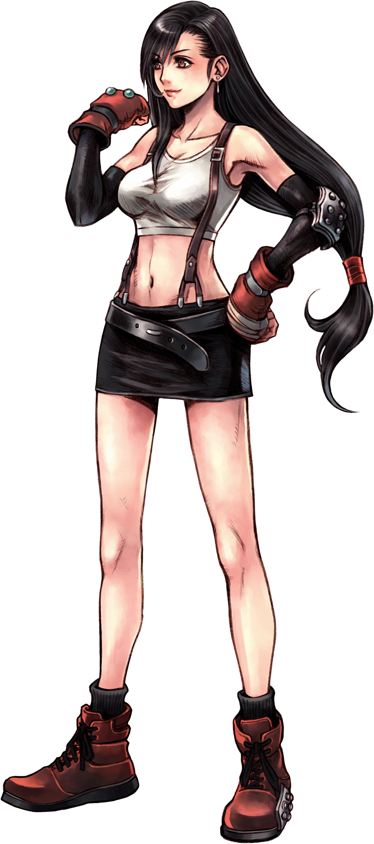 Tifa's outfit is based on Yuko Moriyama from the Zeiram movies. She wears the same white tank top and suspenders combo with a pair of pleather pants that get torn up and looking like a skirt or booty shorts by the end.