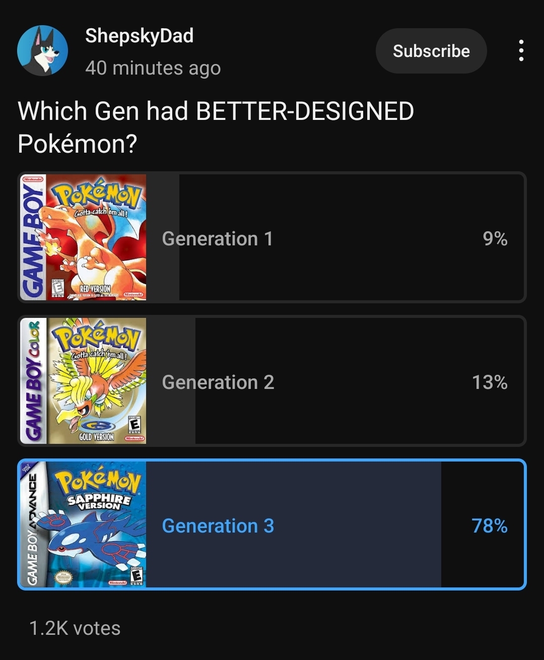 >aesthetics>peak gameplay>peak music>peak storyFor me it’s the gen3 games