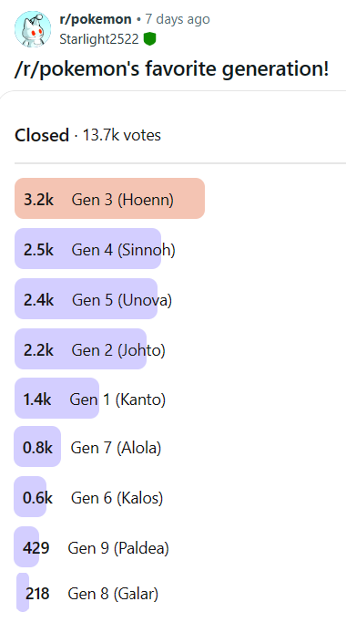 >>12434009From a clear biased position. As it highlights none of the improvements gen 3 made over gen 2. Or any of the failings gen 2 had compared to gen 1, that perhaps gen 3 succeeded at. I mean, look at this. >and EVERYONE was crushed when they beat the game and there was no second regionNot just anecdotal, hyperbolic and wrong.