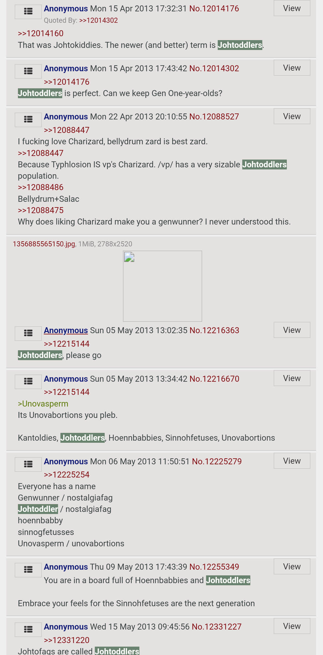 >>12434568>That guy is calling others toddlers for not liking the third rehash of Pokemon as the best because its edgyonce again, you are a newfaggot'johtoddler' non-uniquely belongs to a set of terms identifying each generational fanbase along the same decreasing age gradient