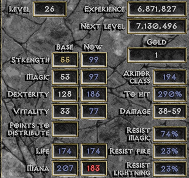 Been playing this with Devilution X and trying different characters. Ended up going with Rogue and made it down to Diablo. I mowed through everything else in the game but hes kicking my ass. Only thing I can seem to do is just chug mana potions with mana shield on while I wail on him with my bow close up. I just need to get the rhythm down right where I never let my mana shield go down otherwise he fucks me up.