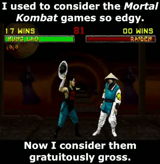 The fatalities in the original MK trilogy were fun because they looked so goofy with the lo-fi graphics and the 20 ribcages and skulls flying out when your opponent explodes. Modern MK just feels like weird snuff shit.