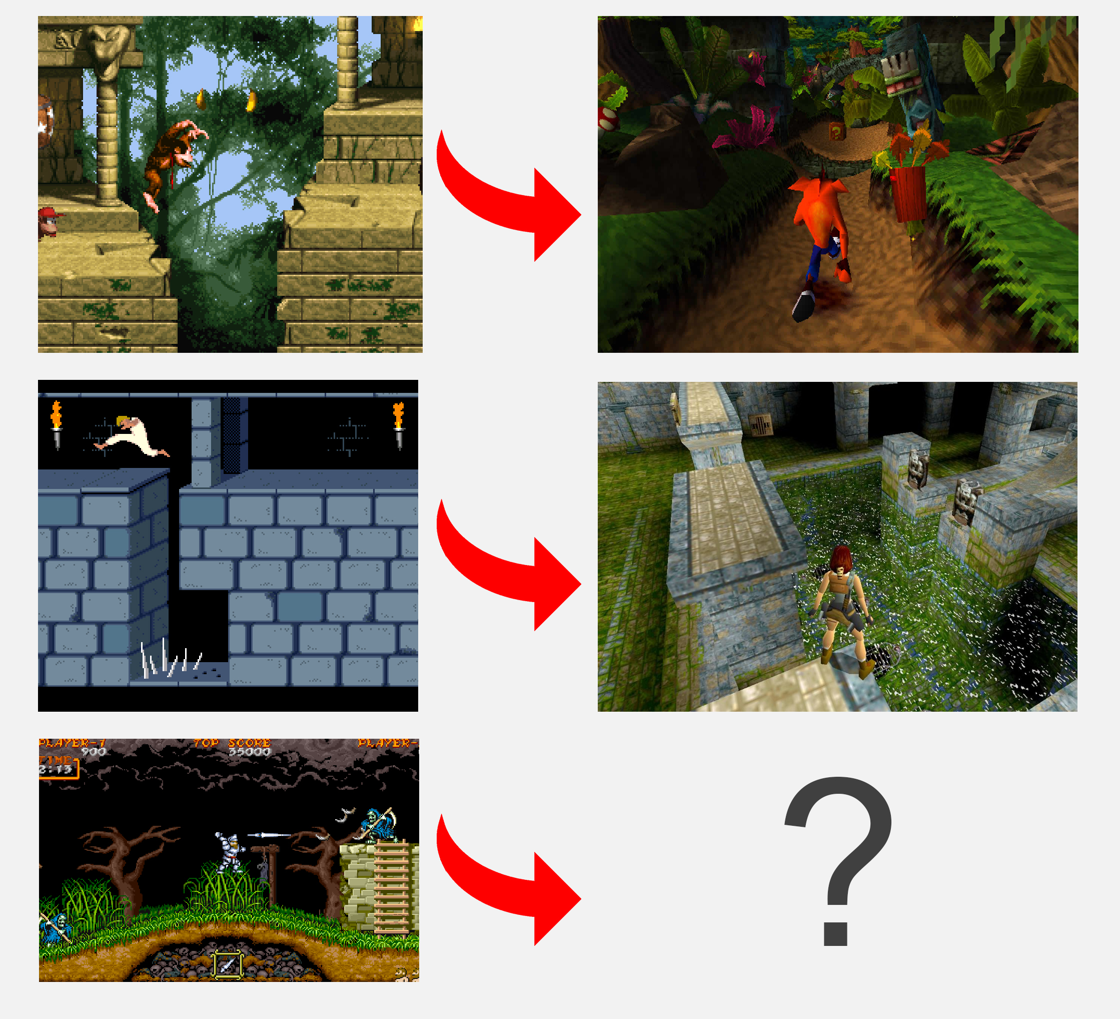 >>12439164Not surprising that the 6th gen babies responding just don't get this at all. Interesting how they simply don't even seem to notice the effects of 3D dead space.>>12439545The specific details are really important.Prince of Persia and Tomb Raider are both exploration games that reward patient, deliberate positioning and execution for the platforming segments. Crash Bandicoot is a lane platformer with side-scrolling levels with a lot of similarity to DKC in gamefeel (not merely aesthetics-- Crash plays much more like DKC than Mario, for example).And he's right. Maximo only counts if you totally ignore all the 3D navigation bloat. Totally changes the gamefeel.