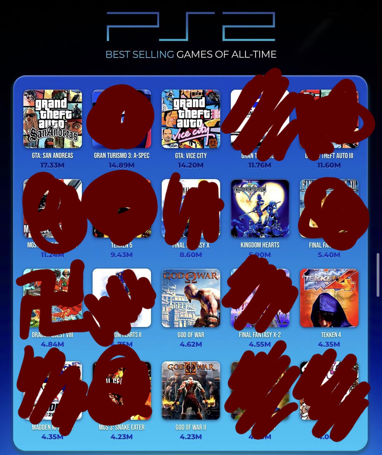 >>12448584It's honestly funny as fuck that this is mostly a way better top 20 list than most others even if it's entirely based on sales. It unfortunately lacks Timsplitters 2 and includes far too many GTAs, but i rarely see lists that include both Tekken 5 and Dragon Quest 8, which respectively beat out all the fighting games and RPGs on the PS1.I also unfortunately can't properly count KH2, because FM didn't even release on the console outside of Japan, and the original game is bad.