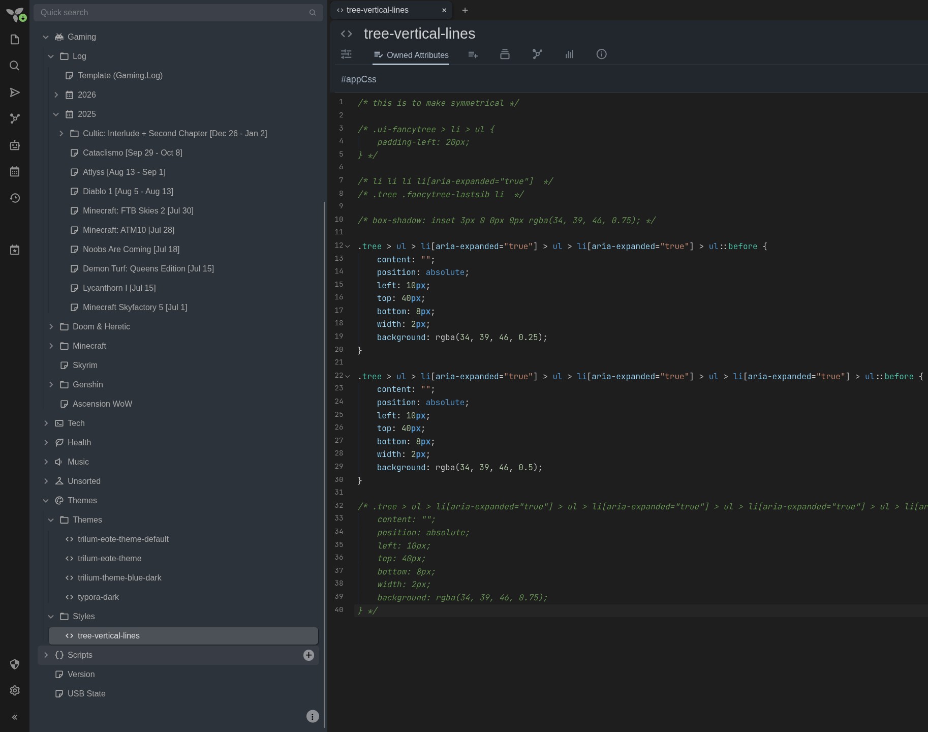 >>12484189I use trilium-eote-theme and some custom css to make vertical lines in tree to my liking (both need to have #appCss tag to make them applied). But it is still the same design style, just not looking as bad as defaults.