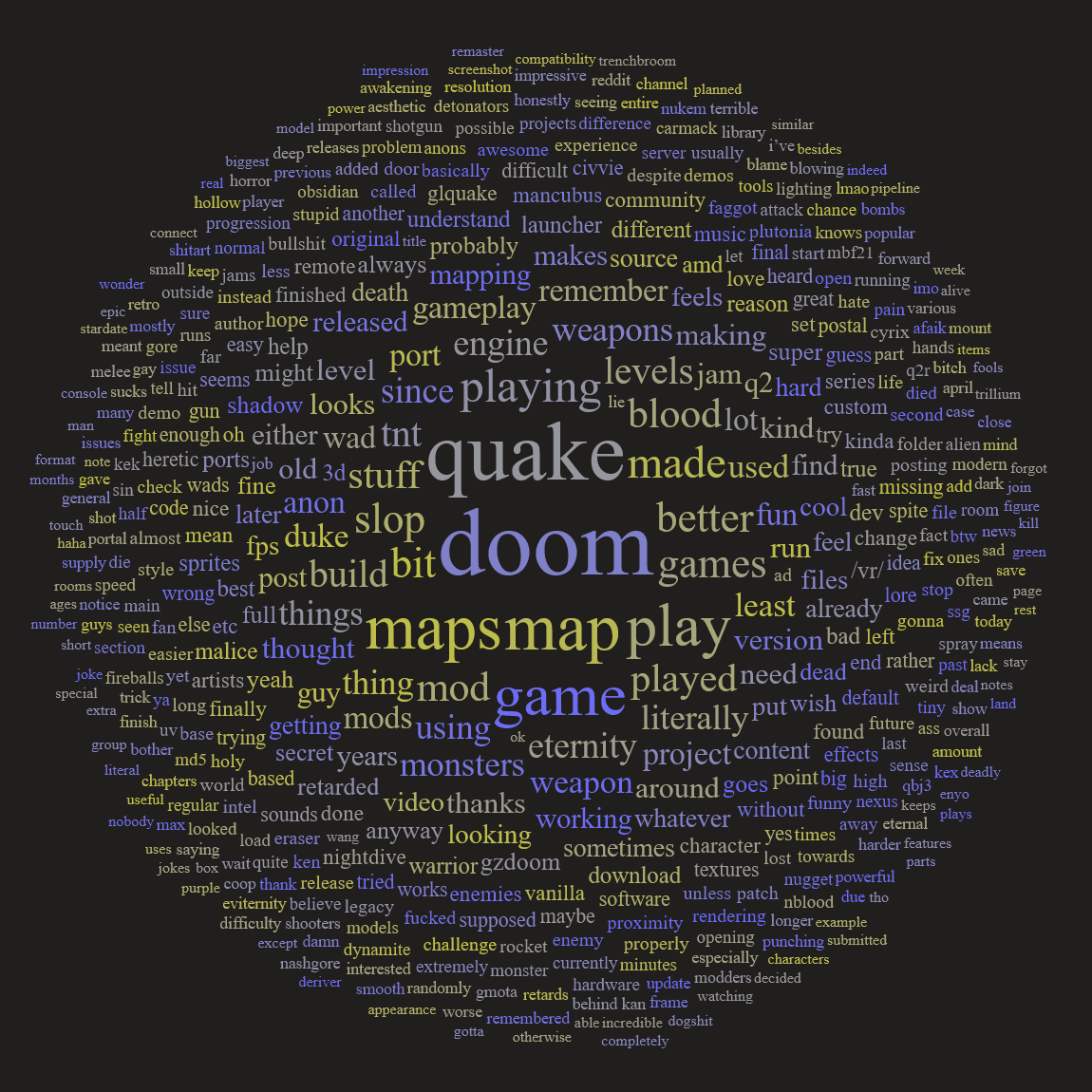 >>12484778>>12484894It's definitely because it took inspiration from the general internet perception around the time Doom 2016 was being developed. The general public had already forgotten about vanilla Doom. Doom was known for Brutal Doom, the Doom comic and memes stating that Doomguy could run at over 100 km/h or whatever. Also comparisons with Halo and Master Chief making Doomguy look better. NuDoom aesthetic is more like trying to look like a metal album cover than trying to look like Doom.