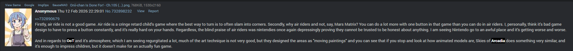 Skies of Arcadia is absolute dogshit and its only merits are purely cinematic insofar as copying the presentation style of OoT insofar as having scenes presented as "3D paintings" with abnormally animated characters for the period. The gameplay is utterly vile and repetitive, and the game design is basically just two hallways with a braindead toddler puzzle. It even copied the skullita collecting from oot. It's just oot with the gameplay gutted, and I dont even like oot. There's really nothing intelligent to be said about this slop, obviously no one is going to play it anyways, as that would be boring.