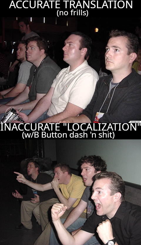 >but the official translation was lame it included a dated Bill Clinton joke and...And the original Japanese text didn't have bad pop culture and current events jokes in it?