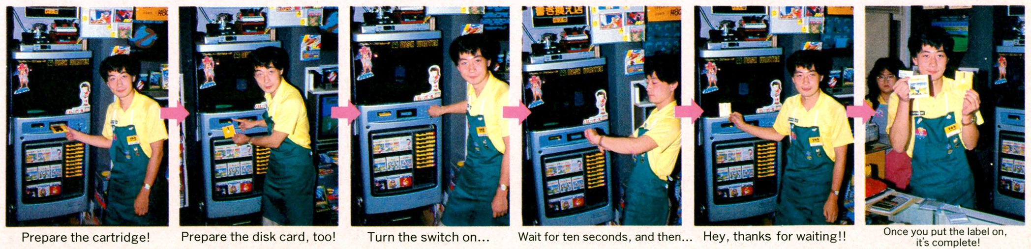 >>12501679Game stores in Japan had a kiosk called the Famicom Disk Writer. You could pay 500 yen and have an FDS disk overwritten with any game the store had a disk writer cartridge for. You could then optionally pay an additional 100 yen for a manual. The service was also provided via mail order, all the way up until 2003.The idea behind it was that a consumer would have a limited number of FDS disks, so in order to get a new game from the disk writer, they would have to overwrite an old one. This means they acted as a sort of rental service, though you could game the system somewhat by buying a copy of an inexpensive game just to get the disk, and then immediately overwriting it with a more expensive game you actually wanted.