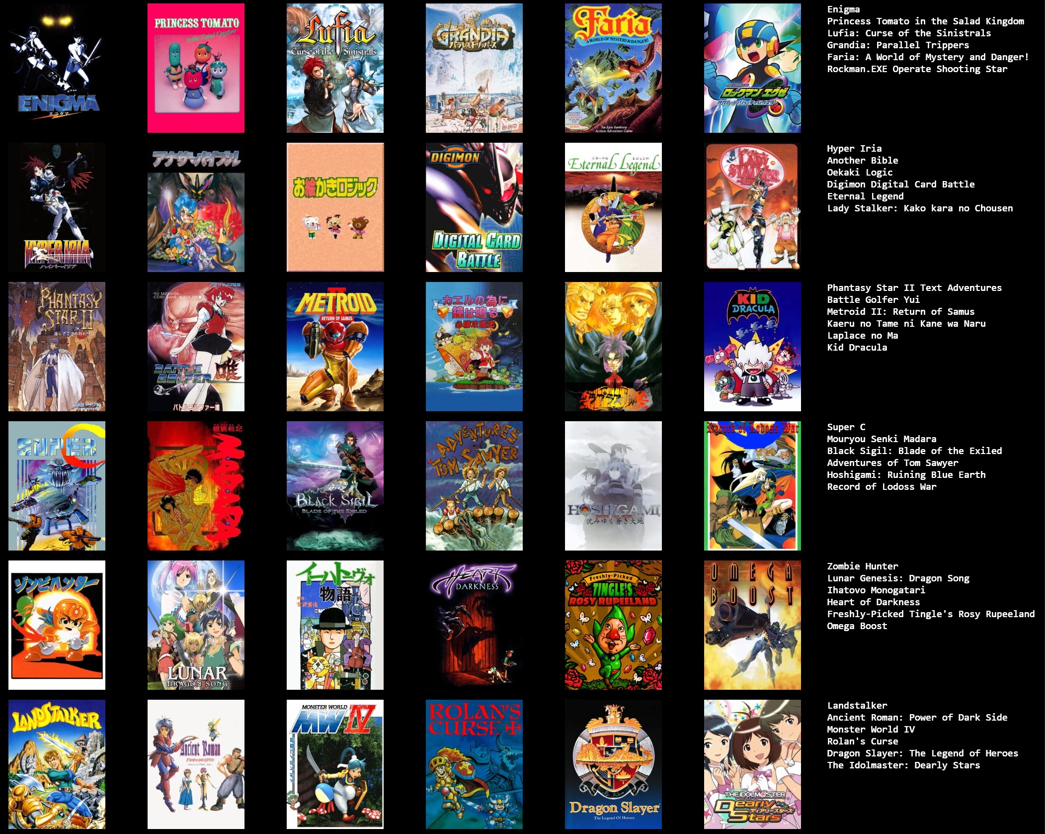 I have seen many people use this topsters site to list favorite games but I was given an idea to use these to make bingo sheets to complete unfinished games.Here is an example and some optional rules to keep this sane:- Have as many systems as there is for games. For this, we have 6 games for 6 catagories: NES, SNES, Genesis/GameGear GB/Wonderswan, PSX, DS- Use dice to place each game on the board, if you don't have dice you cna look up a virtual dice roller and roll that twice to give you the X, Y coordinates. Alternate direcitons when you roll duplicate numbers, and halfway through when i kept rolling duplicates I just flung them onto the board in a spiral motion.- Try to keep each category under 500hrs, less if you want because when I first made this I put a ton of JRPGs on this and that's probably a good way to NOT complete this. Look up somehting like howlongtobeat and those usually have good estimates.You don't have to reply with a picture of your board, if you criticizing my choices, I purposely put kusoge on mine, as well as some games I just never got around to finishing, and because this board is fucking dead anyway, you don't have to reply. I'm not sure if this is really a verifiable method, but I've already finished Phantasy Star 2 and am working on Lunar, I don't really have a plan for 'bingos' because my plan is to finish them all at the rate I feel like doing them.I just want to give a suggestion and maybe this will help us all to finish our backlogs.