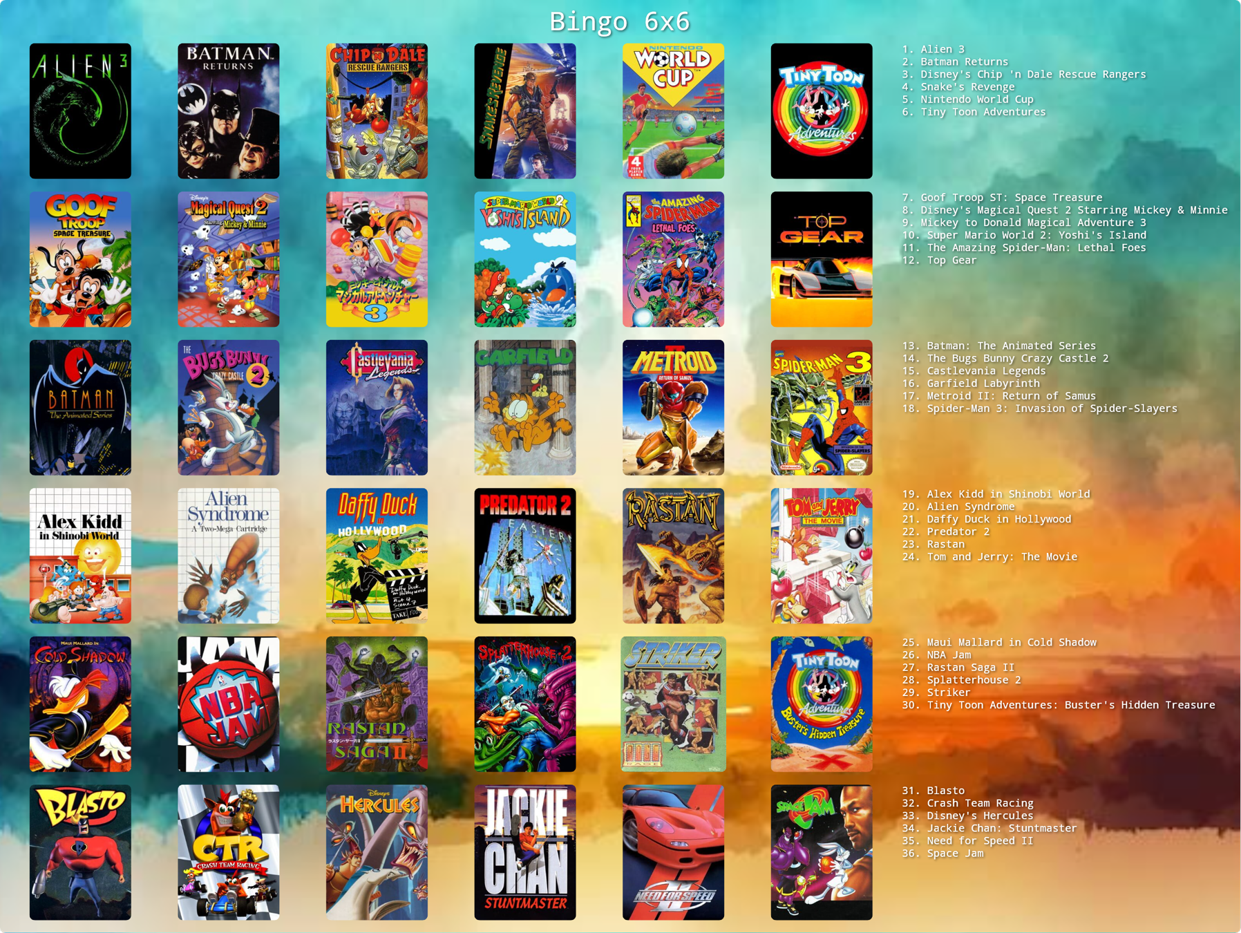 >>12502641>>12503747Here you go, I've made a 6x6 with NES, SNES, Game Boy, Master System/Game Gear, Mega Drive ad PlayStation. I've rolled Jackie Chan Stuntmaster on PlayStation, so it's time to give that a go!