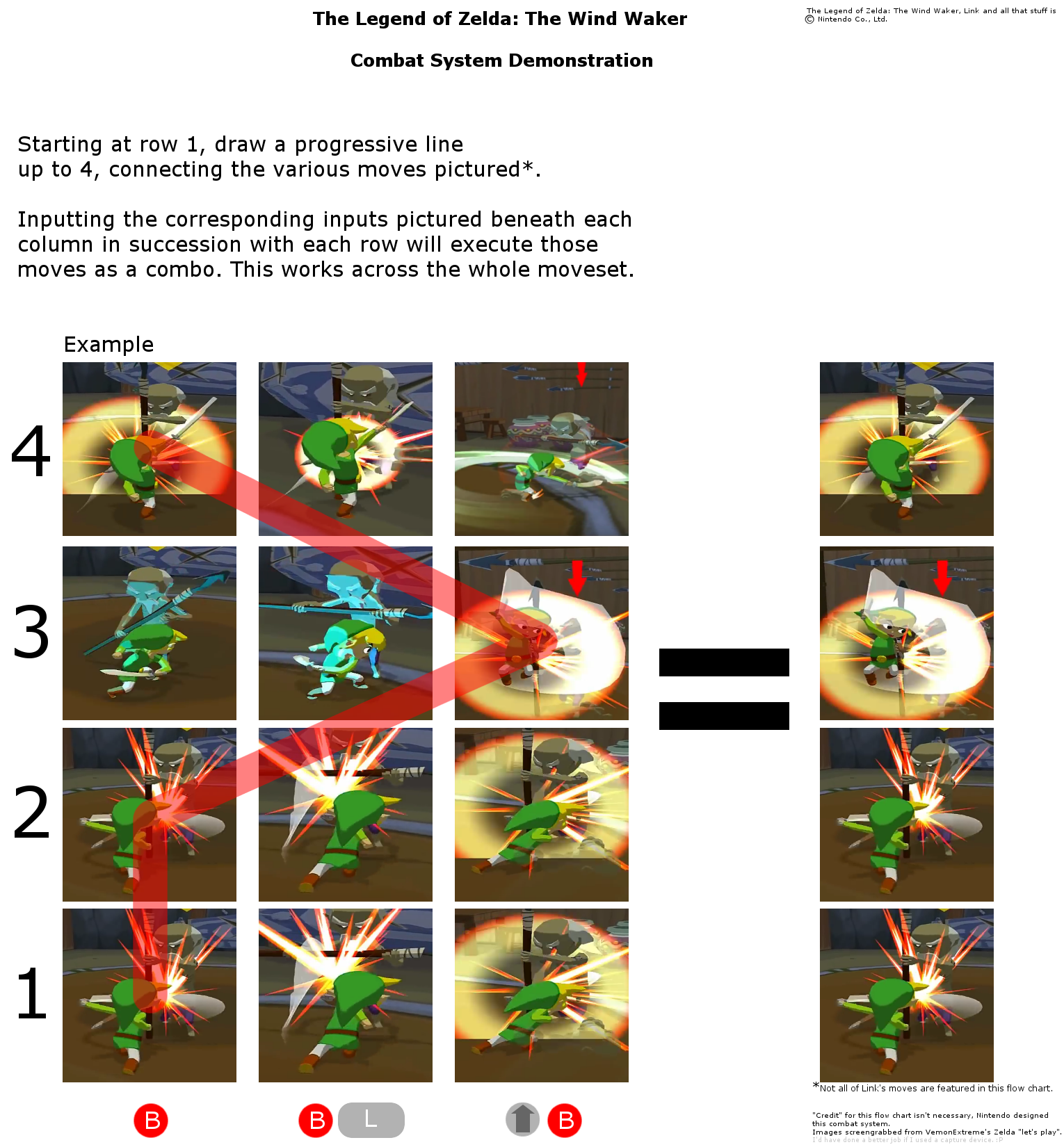 >>12508048Wind Waker's combat isn't as braindead as >>12508059 says, but the combo variety plays a negligible part in it anyway. Things like knocking enemies over or stunning them is more valuable than anything else, and I don't think there are any enemies that truly respond differently to the various attack angles, whether blocking or not. Maybe stabbing is slightly faster? Maybe knockback angles are different? Anyway, the easiest way to challenge the player is to simply throw more and more enemies at them, which is arguably too hectic to be considering directional attacks during. It's a shame that the options aren't important.The Darknuts are a bit more interesting, since the QTE has two different possible outcomes: removing their chest armour (which you can also do without a QTE), and removing their helmets. In the former case, they become vulnerable to regular sword attacks. In the latter case, they can be stunned by boomerangs and looted via the grappling hook.All that aside, the Wind Waker combat still feels great, which I think is valuable in itself.