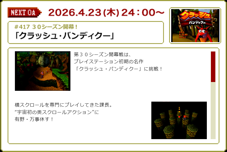 Latest sub:>Game Center CX #361 - Whirlo [LocationScouts]https://nyaa.si/view/2090036>Season 30: Episode 1 (#417) Crash Bandicoot {PlayStation} premieres on Thursday, April 23rd. This episode includes the first installment of Chief Arino's Ultimate Rare Pokédex, which features hunts for the most uncommon Pokémon. With Season 30 being a multiple of six, the recurring tradition of a "curse" befalling the King is expected.https://otn.fujitv.co.jp/gamecenter/index.htmlhttps://pastebin.com/u/GCCXGeneral