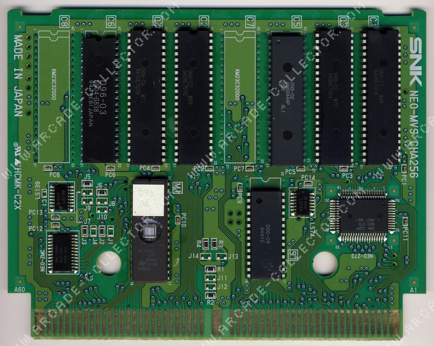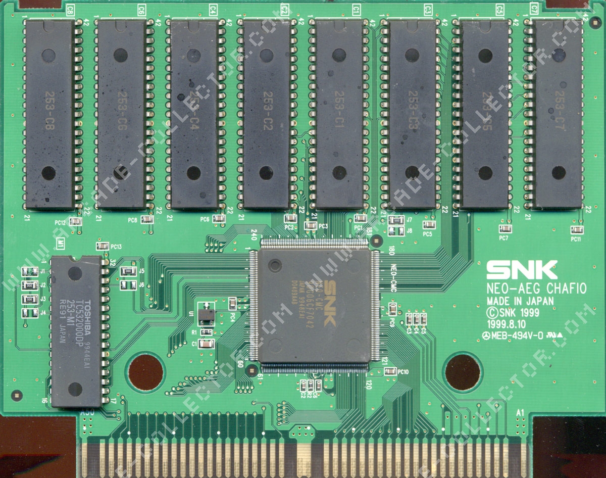 >>12518339>It is a shame with the cartridges being flashHow much does that really matter?Let's look at a real Neo Geo game. Here's the graphics PCB for Garou, which is one of the games they'll be releasing. See the big chip in the middle? That's a Toshiba TC190G ASIC which handles decryption of the graphics data, because the ROMs themselves are encrypted to prevent bootlegging. The Neo Geo itself doesn't even directly interface with the ROM chips.As a matter of fact, there's decrypted ROMs of Garou available these days, which is likely what they'll use to avoid having to recreate the decryption chip. So does NOT having the ASIC make it less legit now? Does it actually matter if it's Mask ROMs or Flash? There's even a few examples of legit old Neo Geo games with Flash and even EPROM chips on them.