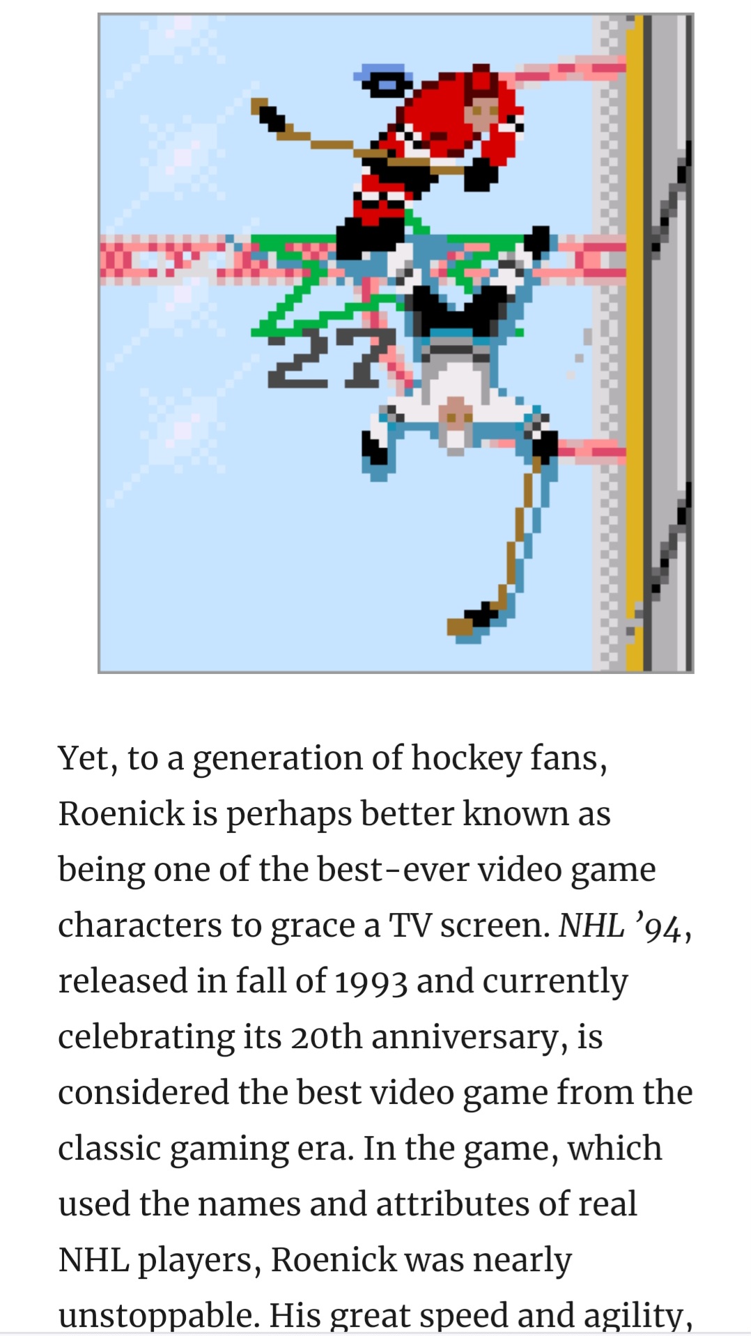 >>12529038Especially NHL 94/95 as those were generation defining games. You couldnt have paid me to sit though a televised hockey game back then but I put hundreds of hours into those games.I knew the blackhawks and redwings were top teams, and learned who Jeremy Roenick was because of it.>Jeremy Roenick: The NHL ’94 game is the one topic that is mentioned to me most often to me in my lifetime. I have more people who come up to me — that know me — because of NHL ’94. People that got through college playing as the Chicago Blackhawks and Jeremy Roenick. Some had rules that you couldn’t be Roenick in the game because how good he was. I wish I was as good in real life as I was in that video game.