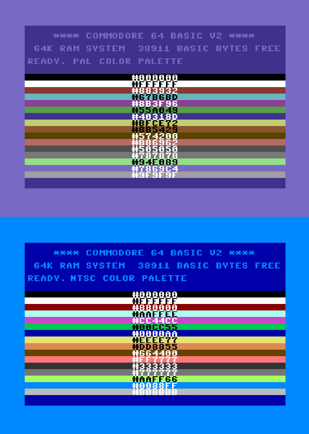 >>12536927I accept your concession.It's nice that you've learnt that the C64 had different NTSC & PAL palettes due to the differences in video signal timings. Good for you!
