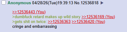 >>12536443>dumbfuck retard makes up wild story >>12536169>gets shit on twice: >>12536363 >>12536420cringe and embarrassing