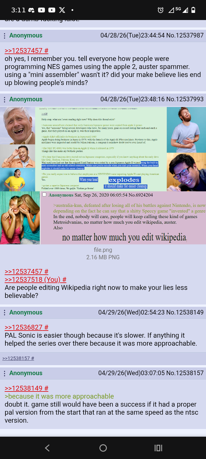 >>12536827>unlike Nintendo.entire library of NES software is full of low effort, bugged and broken software that's excused by simpletons, where PAL releases were never properly fixed nor was there ever an attempt by most developers early on to do so. using the NTSC APU note tables in PAL releases and not bothering to fix anything relying on timing is just quality work. then there's all the revisions of games that were snuck into production to fix their broken shit.have you considered not smoking heroin?