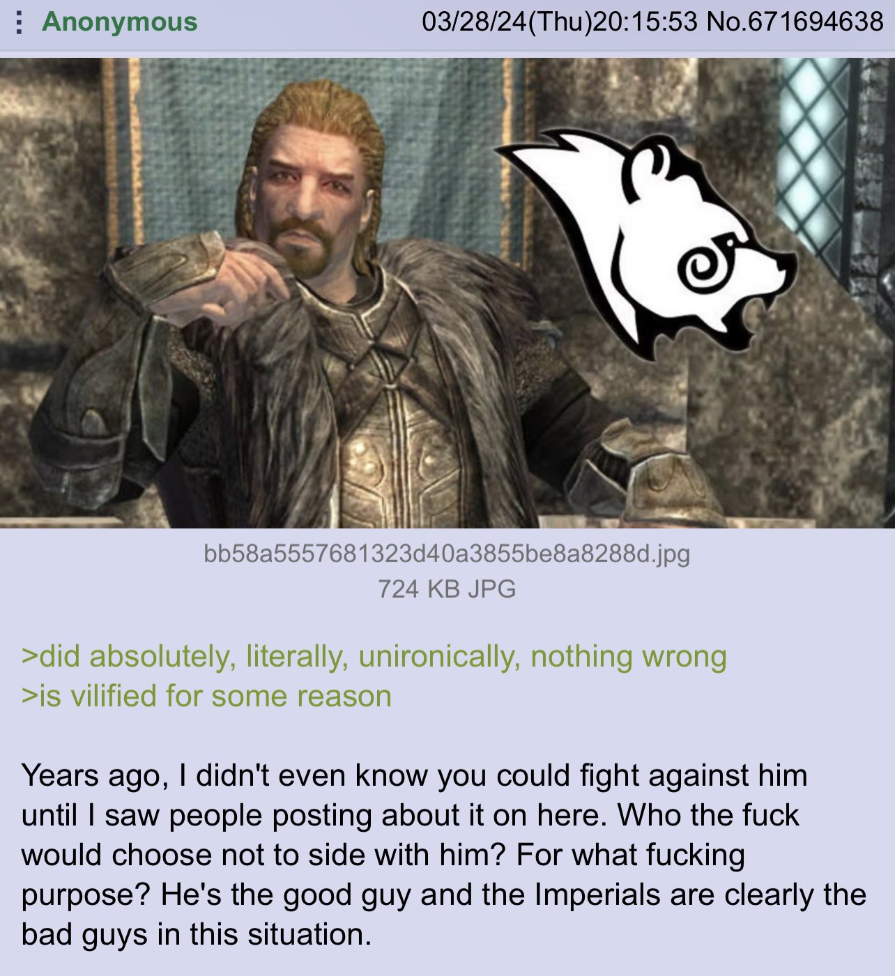 >>3808445>>3808471>>3808660>>3808666>>3809216>>3809391>>3809400>>3810758>>3818796>>3820878For me the decision was really simple:The Empire are the guys who wanted to behead me for no fucking reason.Like, Zero.All I did was cross the border and apparently this was enough to casually warrant my execution.Obviously as I am running for my life after the dragon attack I dont side with the dude who just a second earlier went "Oh yeah, you are going to be executed for no reason, sucks to be you. my bad bro ".This already frames in my head that the Imperial Influence is callous at best and completely indifferent about injustice or cruelty at worst.And this continues throughout the game. In Whiterun I encounter a family whose family members were taken away by the secret elf police for following the wrong faith and members of the rival family who snitched on them gleefully mock them for it.During travels I encounter a shrine of Talos where a secret police Elf massacred a bunch of Nord citizens or the secret police transporting prisoners to god knows where to never be seen again.In Solitude I witness the execution of a guard whose only crime seems to be that he didn't close the gate fast enough and allowed Nord-Hitler to flee and because the Imperium needs a scapegoat he gets promptly murdered.My point being that unless you are a total leftist NPC whose only problem seems to be "nationalism bad!" the game shows you exactly zero reasons in-Character to side with the Imperium or even consider the Imperial Rule of Skyrim a benevolent rule or a good thing.Ergo: If you think that Imperial Rule is better for Skyrim after having played the game you are a metagamer.