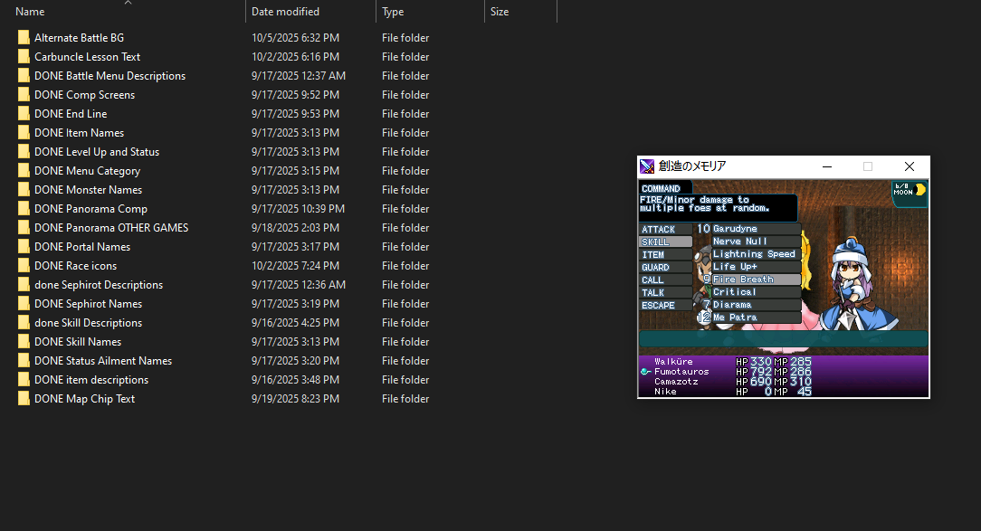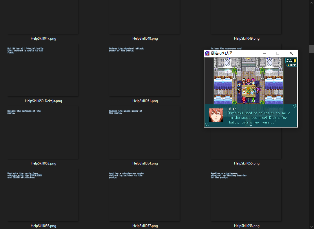 >>3863531>StrategyDepends on what the images are, the file naming scheme, potential modifications to the interface or the code. Some common points for me are>transcribe the text accurately from the files into a text file as initial groundwork (yes, this takes a while, but it is well worth the time cost later on)>do a quick, rough cut of some of the larger/largest ones and see if you have room to spare or need to make adjustments to sizes, fonts, etc.>write small "programs" in maniacs to dump large amounts of images with the text on it (this helps if you need specific system color gradients) and consolidate them into a single sprite sheet and unify the color palettes/indices so they don't crash 2k/3>depending on file naming scheme, you may be lucky and be able to quickly export these "frames" with sequential filenames (though, take care to look out for "gaps" or sub-entries), or you may just have to go one-by-one and export them by hand, or mass rename them later onIt's never a one-size-fits-all thing. The need changes often, sometimes within the same project for different categories of files. Most importantly, just understand that it's going to take time. More than you think.>Soldieress series gamesI only intend to release 創造のメモリア once I'm done with it since, though it caps off the Soldieress Saga, it also stands alone reasonably well. My plans are always subject to change, though. I will NOT be doing the loosely related and final Mio game, Megalomania, however. I just don't personally like the gameplay. Someone else can deal with it, and if they want/need support for the graphics/programming side, then I'd be willing to assist. Someone I know expressed interest in maybe TL'ing it, and more power to them if they decide to do it, but that won't ever be me.>people thought it would be impossibleThat is because they never tried.