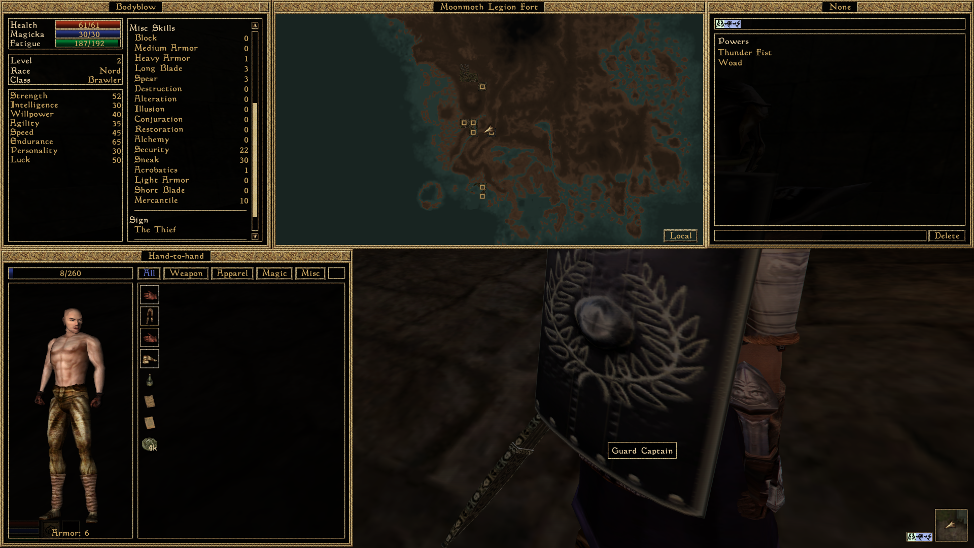 >>3843209>playing sword and board in tes 3 as a first timer>ctrl f>0 hits for sujamma, divine intervention, or almsivi restorationits like you fuckers dont even play the game. keep a couple scrolls of almsivi restoration or divine intervention on you alongside some sujamma to get you out of a pinch. when the time comes you'll know what to do with them and be glad you have em on you. op id recommend taking minor in light armor initially and when you get your stats and gear up transition into heavy armor both long and short sword can stagger effectively so getting hit becomes less of an issue. if you explore diligently youll come across a lot of expensive and useful loot but because of low stats and high encumbrance from heavy armor you won't be able to carry all of it or transport it without dealing with crazy tedium. dont give any thought to the fuckers telling you to minmax this game. the initial stat spread from character creation saves you a couple hours of play at most when gear and game knowledge does 90% of the heavy lifting. maybe consider using an autoclicker to grind unarmed and speechcraft. smack mudcrabs around for a bit for a 5x to speed on level up and spam admire/intimidate on weak npcs after popping a telvanni bug musk. and if youre really enjoying the game consider heading over to the uesp and reading the calculations for your rolls.