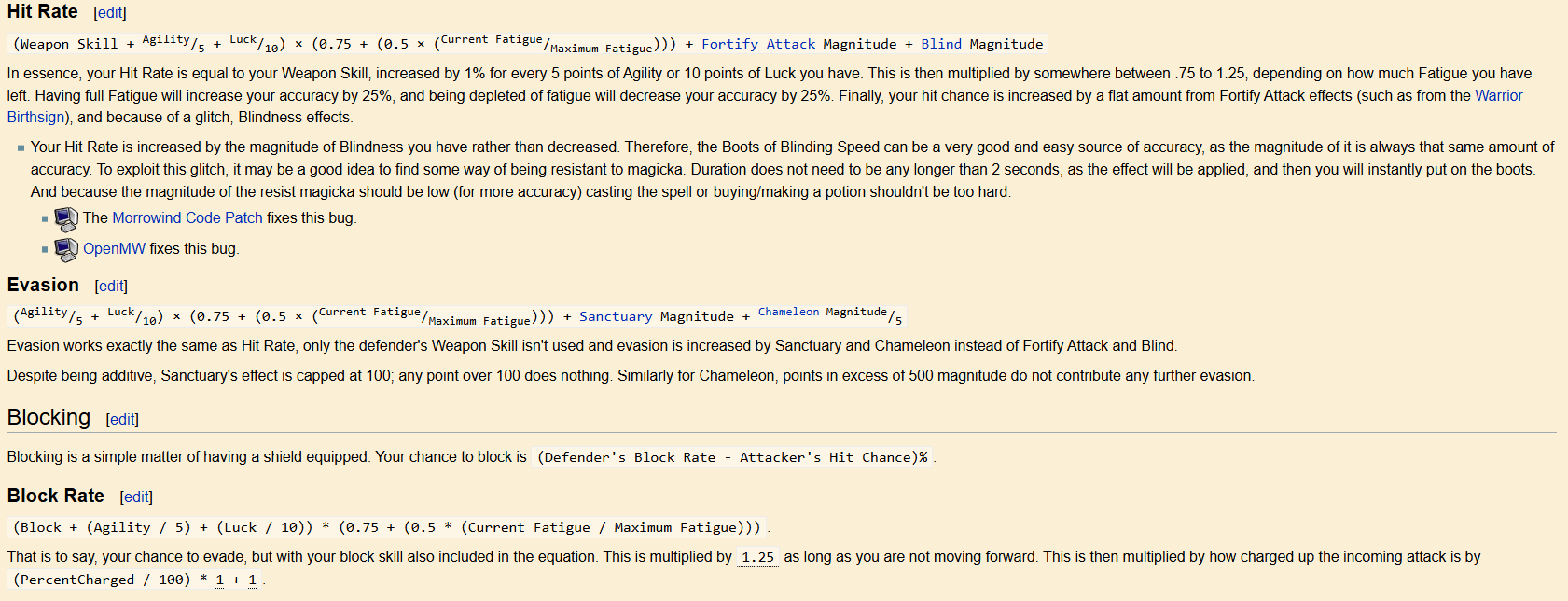 >>3861241theres nothing that can directly do anything to boost unarmed damage besides mods but items like the fists of randagulf will help you by giving a +20 to agility and strength making you faster by lowering your encumbrance % and making you harder to hit. i can't think of any items that give +luck but those are counted towards your hit/miss rolls.enchants or spells that give you sanctuary or chameleon will give you a flat % bonus to your dodge rolls but those only apply to melee attacks, which are calculated differently from touch spells which you can only mitigate with willpower if i recall correctly. blind spells/offensive enchants would obviously affect enemy hit chance.might be worth carrying a shield since its calculations are done if the enemy actually rolls a hit against your evasion.