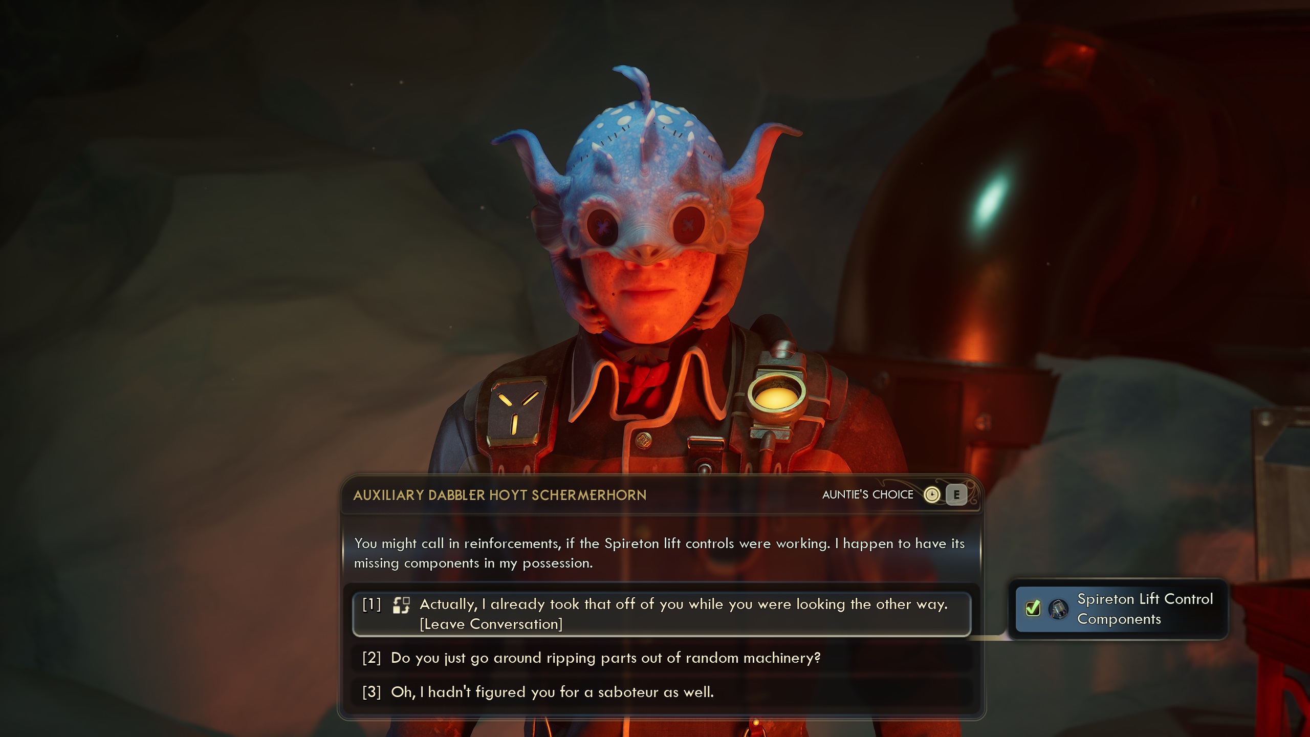 >>3867002>I regret taking the auntie choice gal, I want to vent her out of the airlock.Part of some of the faction characters arcs and how you can influence them is that they can go from brainwashed supporters of said factions to abandoning them.For Inez one is her abandonding Auntie to go freelance because she becomes disillusioned with them in her personal quests.It's a similar deal with Aza and Tristan.