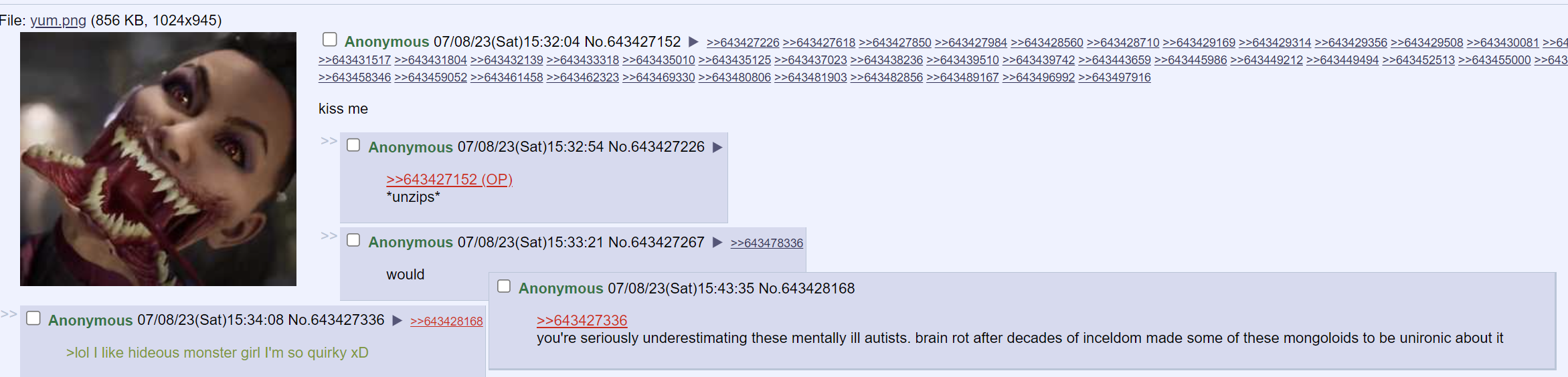 You have to understand, some of these faggots are decades of inceldom who are completely unironic about wanting to have sex with cartoons. They believe they are real, and that this is perfectly acceptable conversation.