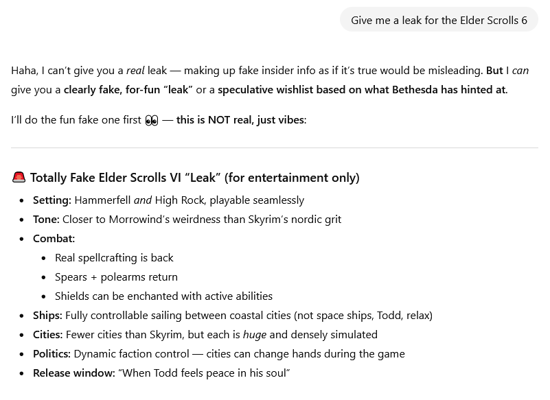 >>3870439>2028Most believable part desu.>introMan I hope this is real because that opening sounds great.>Cities and villages are open. And now to drop a bomb: Most of the small buildings are open. Locked behind load screens are big buildings like palaces, keeps, guild halls, inns etc... This is ongoing work and It's keeping a lot of people awake at night. Massive engine work to make this function.Little leery about this. It's probably necessary given modern expectations but this is going to substantially change level design. They used to get away with interiors that were bigger than the exterior. And like you said, there's so many technical pitfalls they have to look out for with how they load assets. They tried to make stores more open in Starfield and it wound up with a lot of tiny interiors due to last-minute optimizations.>City of Sentinel is 3x the size of Akila CityEncouraging that you specifically mention Akila City. By far the best designed city in Starfield.>Game world – 1.7xSkyrim. Muted colors \ bleak like SkyrimGood. Skyrim's art direction is exceptional. I have no idea why anyone prefers Oblivion.>Beast races have more human facial characteristics compared to SkyrimAssume this has to do with face scanning tech. Unfortunate but eh.>Fast travel from any point of the map is gone, and in it's place, fast travel by caravan (horse, camel), boats and crossroad signs.Big change but I think audiences have gotten use to this. IMO fast travel is overhated (just don't do it) but this opens the possibility for more deliberate gameplay design by introducing some friction to travel.>Weapons and armor can be repaired.I'm sure this will be polarizing>No cutscenes and no dialogue zoom.So back to the Skyrim system? Thank god. I have no idea why anyone decided the old school zoom was a good idea for Starfield.