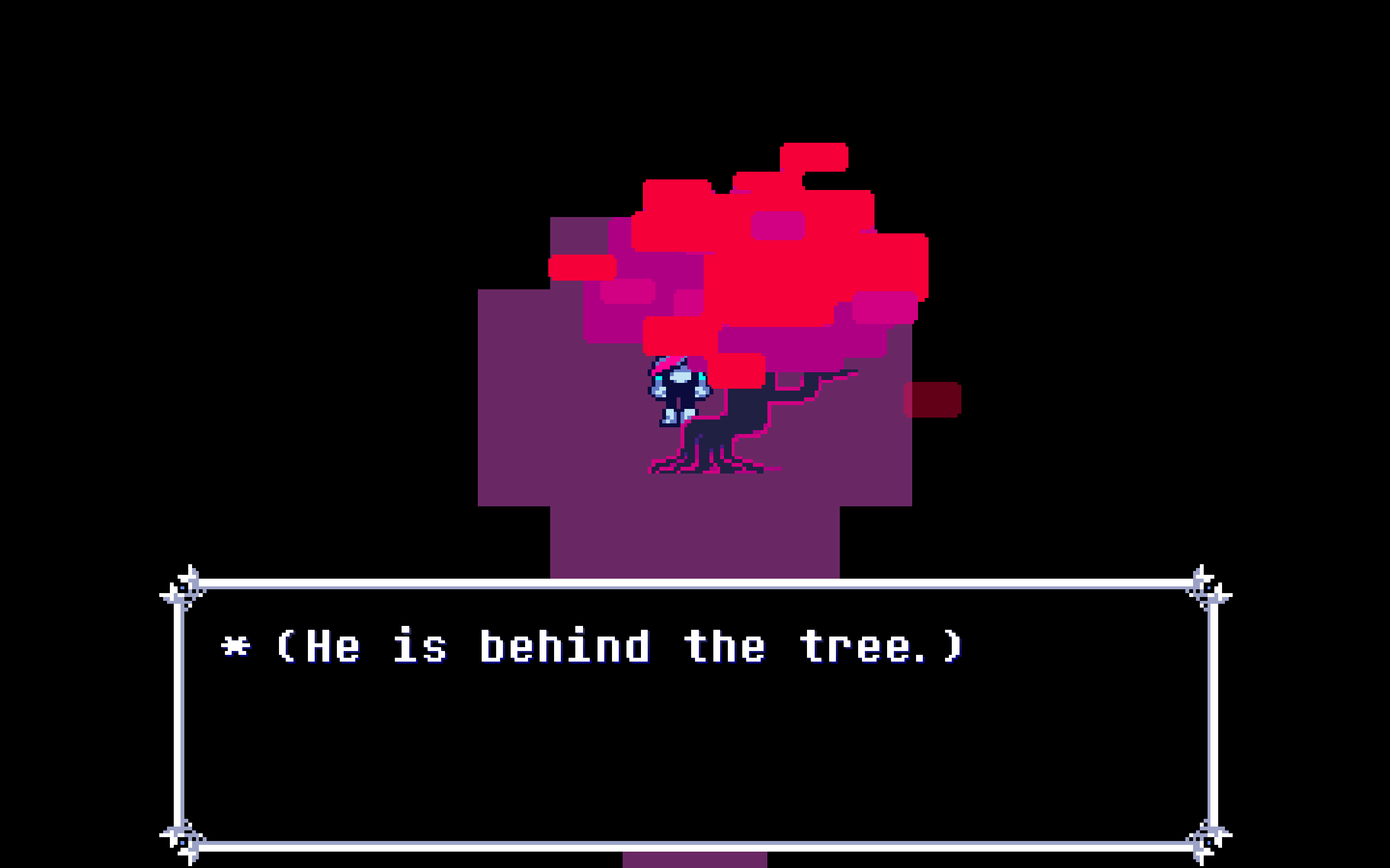 I'm still wondering if Kris is the Man behind the Tree. especially since the strange Valentine required you to "squint your heart" and seemingly only in that one Egg Room where Kris is reverted to his light world form before walking behind the Tree being the only place "in game" he can talk to you before it disappears, and the stuff about how every time you see "A Man" in the Light World it's when you have Kris look at a reflective surface, the car window, the diner, and it's sort of described in a similar way Kris kind of talks to you in the mirror at the Dreemurr House.Especially since even if The Man can't communicate properly in Chapter 4, he's way more active since you can't see Kris's body at all.