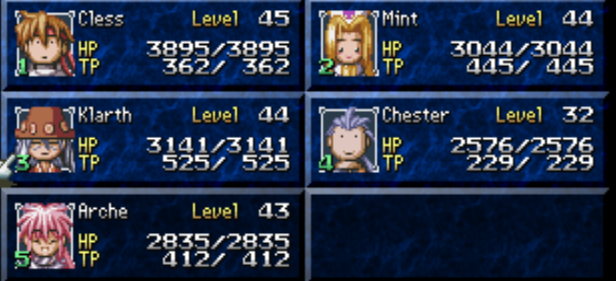 >retards discussing inconsistent localizationOfficial names: Cless, Mint, Arche, Klarth, Chester, SuzuCope, seethe, D I L A T E