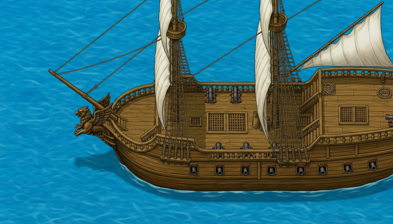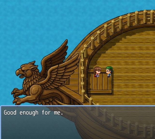 >>3927726I use a prompt like>RPG Maker map. Front bow of a sailing ship. Top-down orthographic, Smooth hand drawn raster art tile graphics. Curved hull and wooden railing. The ship is facing left. Griffin figure head.And then I just uploaded the output as a parallax with ! in the front of the filename so it acts as a floor. This is without any photo editing. Took me...idk, 5 minutes while composing these posts. Realistically, I'd spend more time refining the prompt or touching up the alignments in GIMP or something.