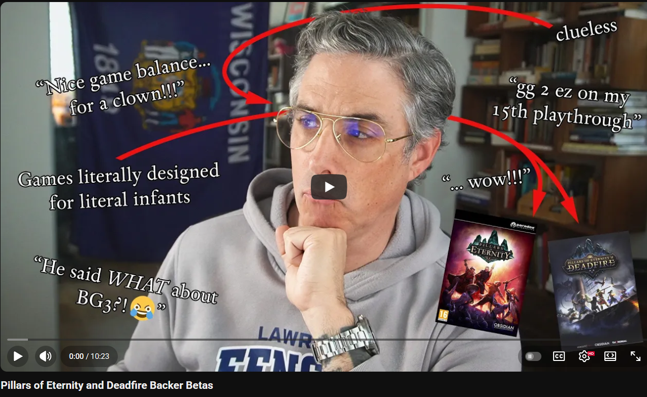 >>3912675>more damage to crpgs than anyone alivemore damage to classic crpgs for suresince he basically single-handedly started the crpg renaissance which promoted an abundance of all sorts of projects from indie to AAA and now people aren't buying that old-fart tale of early 2000s being the golden era of crpgs