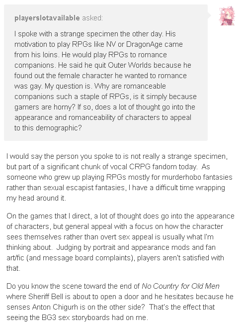 >>3912772wait, so you think chris avellone is stalking /vrpg/ threads unironically? yikes.no seriously, what's your account name there?