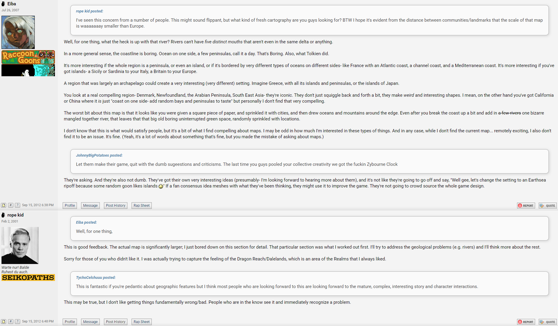 >>3914325>what do you know it actually wasn't about something as trivial as rivers flowing uphillHere's an Obsidian thread from the same timeframe (late 2012) discussing the same thing (the first draft of the Pillars 1 world map during the kickstarter phase) that specifically mentions the river running uphill:https://forums.obsidian.net/topic/62008-do-you-care-about-a-realistic-world-map/page/2/>The biggest flaw seems to be the backwards river running through the Free Palatinate of Dyrwood. The forks in the river are all wrong.Sawyer's response:>The rivers have been fixed for the map, but we haven't been able to update it on the KS site (or elsewhere) yet.Both posts were on 10/28/12.The posts anon quoted (see picrel, "rope kid" is Sawyer) were ~six weeks before this, in mid-September, after they had incorporated their initial feedback from the thread on SA.>it's almost like if some poster enters a thread about with a Basder for a thumbnail he is highly likely to have a Sawyer Derangement SyndromeAn astute reader will note that I never said anything positive or negative about Sawyer, aside from neutrally stating that he is a goon and that he posted about the development of Pillars on SA, which is true.