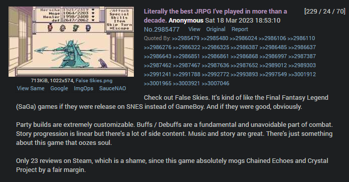 Oh shit, someone talking about False Skies. I'm playing through right now as well and really felt the need to talk about some classes.>Hexer/SageHexer's a class that stumped me early on which is a shame, because it would have been really fucking good for the early-to-midgame. Both it and Sage show how good high damage + debuffing at the same time is. >Gunner/Heavy GunnerWho the fuck needs mages, gunners are here to fuck shit up. Gunner's an amazing class for any offensive mage. Heavy Gunner feels like the same shit with bigger numbers, feeling woefully weak compared to Sage.>Evoker/SummonerReally wish this was good, but they're limited to one element and the numbers on their skills are sad as fuck except for Summon Omega.>ElementalistCoolest class thematically inbetween the elemental learning and the innate S ranks for Zodiac weapons. Really wish the elemental Nails were stronger, I feel like the modifier for hitting weak points is so low that using Blackfang will be better on most enemies. Still, I like the class enough that I made two, a Generalist/whatever/Samurai and a Generalist/Hexer/Shadowmage.>Heavy InfantrySuper cool class that feels hampered by negative priority. I feel like they're just there to throw up defense buffs from Guardian and then do their thing in the background while the rest of the party does the actual heavy lifting.>Barrier MageWay too fucking good.>Heavy ArcherDoesn't seem like a very good class until you slap on a Greatbow and get to enjoy their S rank modifier on what is probably the strongest weapon class in the game. And then they unlock Meta Rain.>Soul StealerSeems cool on paper but fuck me if I know how to build one.>VirtuosoSomeone ITT called it the most OP class in the game, I must be missing something. I do like being able to hit 9999 without any setup on almost all endgame random encounters with Stop, but bosses and machines being immune kinda rains on the parade. Danse was really fucking cool, though.