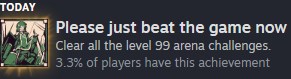 >>3919183Do you remember around what level you cleared the 99 Arenas? My party is around mid/late 60s so I think some grinding is in store.