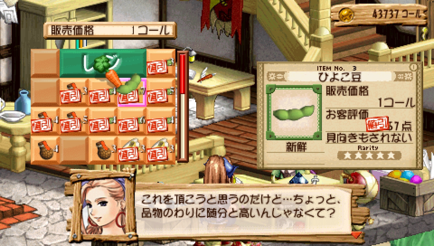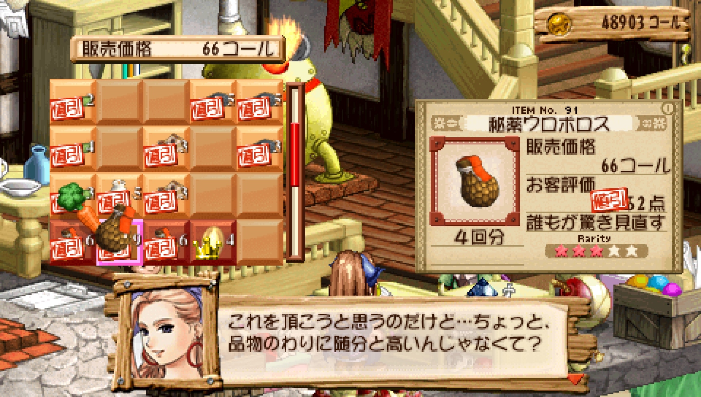 While this isn't an entirely fair comparison since they basically took Judie and built on top of it, the game definitely is better designed.But it actually feels bloated. The gardening is completely unnecessary (and costs too much to install so why bother at all), and the shop feels overdesigned (yet not very fun) considering you already have alchemy/adventuring/requests to manage. And the time limit is back on top of item deterioration. AND you have to build your own furnace/fridge within a fixed point cost that's also shared with storage expansions.Well, I have a feeling this was THE Atelier that inspired Recettear, so I can't say it wasn't worth it.The adventure feel is much weaker this time around, and between Judie's>every inn has a cauldron room that you can indefinitely rent, but you have to haul all your shit over because you can only "rent" one room at a time for some reasonand Vio's>you can synth anything with your bare hands as long as you're at an inn, there's just no access to storage (until you get a bag that lets you access it from literally anywhere)I'm not sure which one makes less sense.Judie was also a much better protagonist, and her game's cast/story were better in general. Only saving grace in this regard is that not only did the PSP version add 2 more new moeblob characters, 2/3 are actually recruitable normally rather than only in the extra dungeon (although having to clear the game and reload for Lapis to appear is idiotic, Sphere's ending didn't even need to exist).Endless mode being NG-only despite NG+ also being a thing is disappointing. It really should have allowed just converting your regular save as-is.