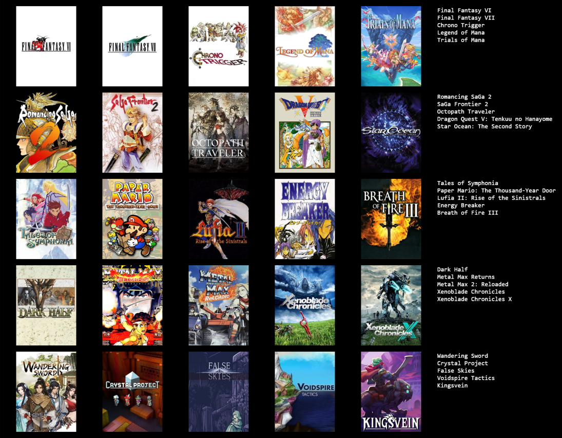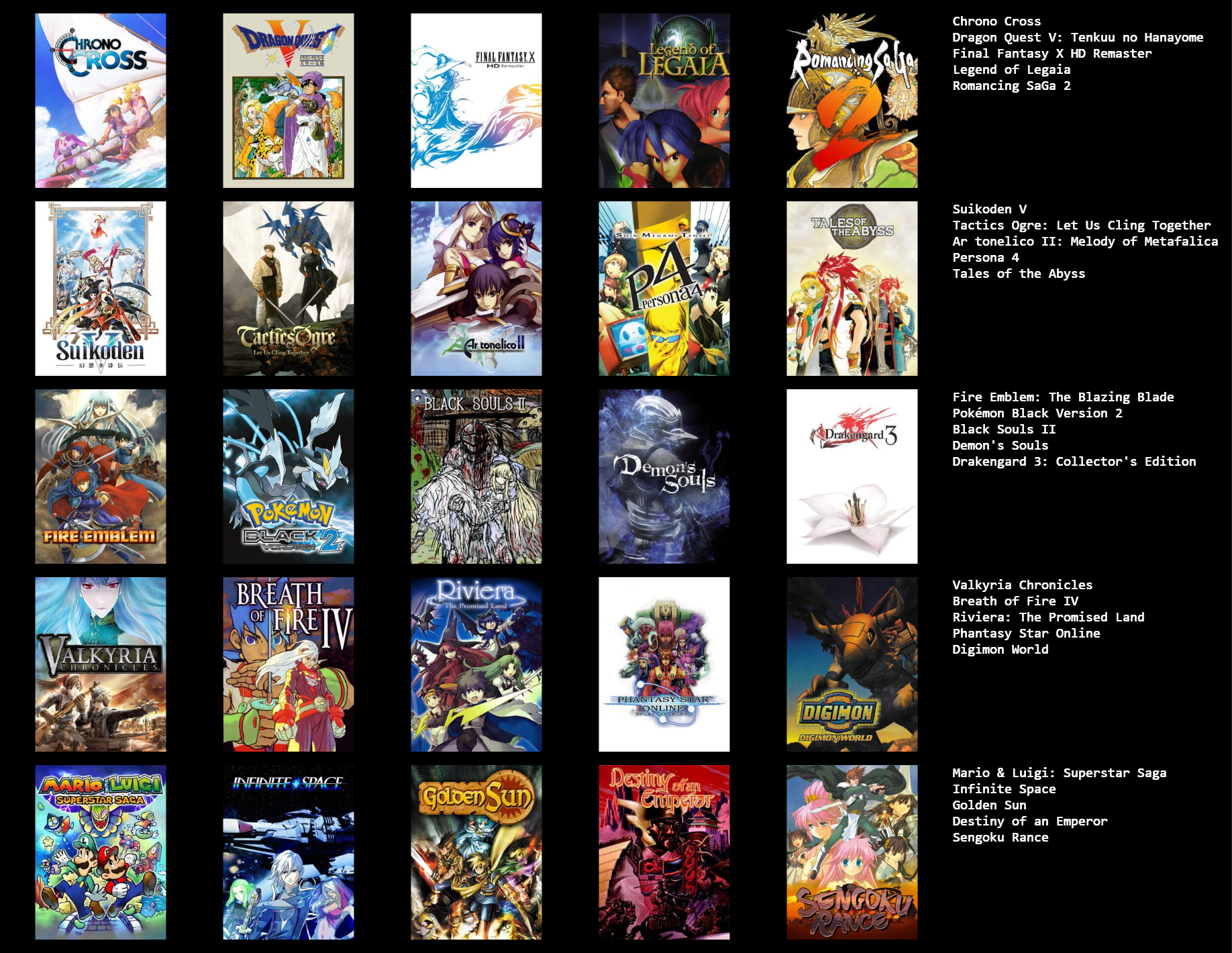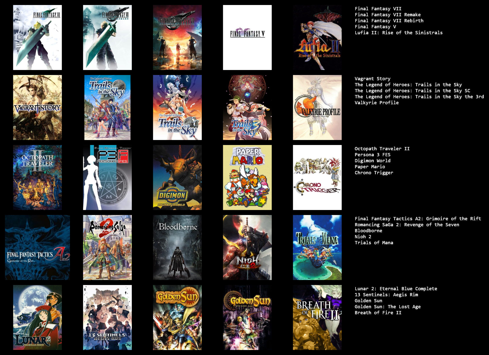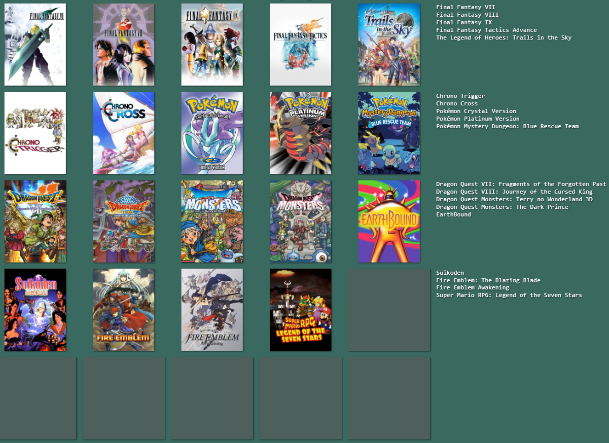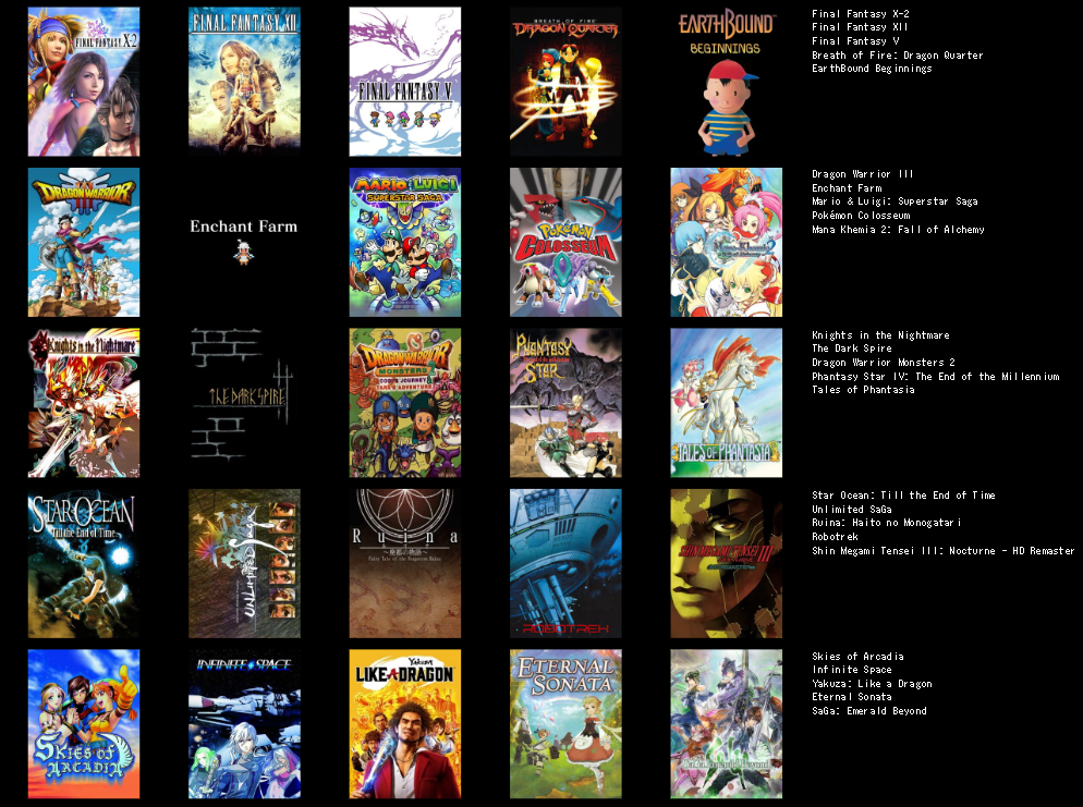 >>3932765I feel like I can only get up to 19/25 games, I could fill in the last 6 slots with jrpgs, but not jrpgs that I actually like enough to feel like it matters, like the seven final fantasies I didn't really like that much.I need to play the mother series, I think I should like at least 2 of those, maybe all 3.Going by other's 5x5s, maybe giving another chance to Legend of Mana, Dragon Quest games & Breath of Fire games, I dropped them when I last tried them though.Radiata stories and shadow heart I should probably play too.
