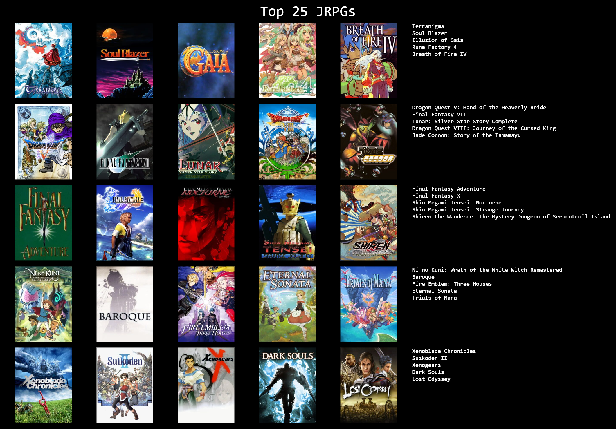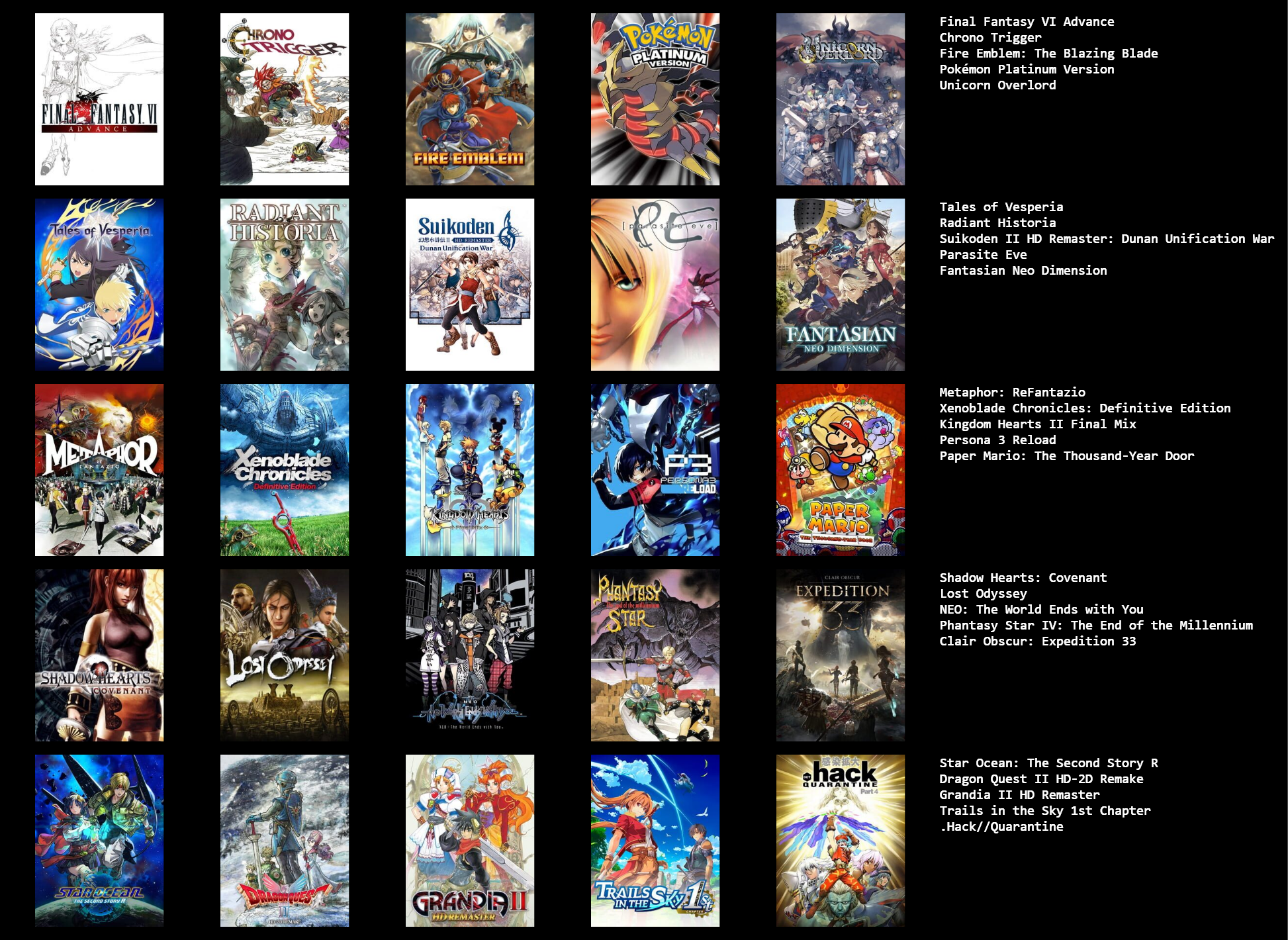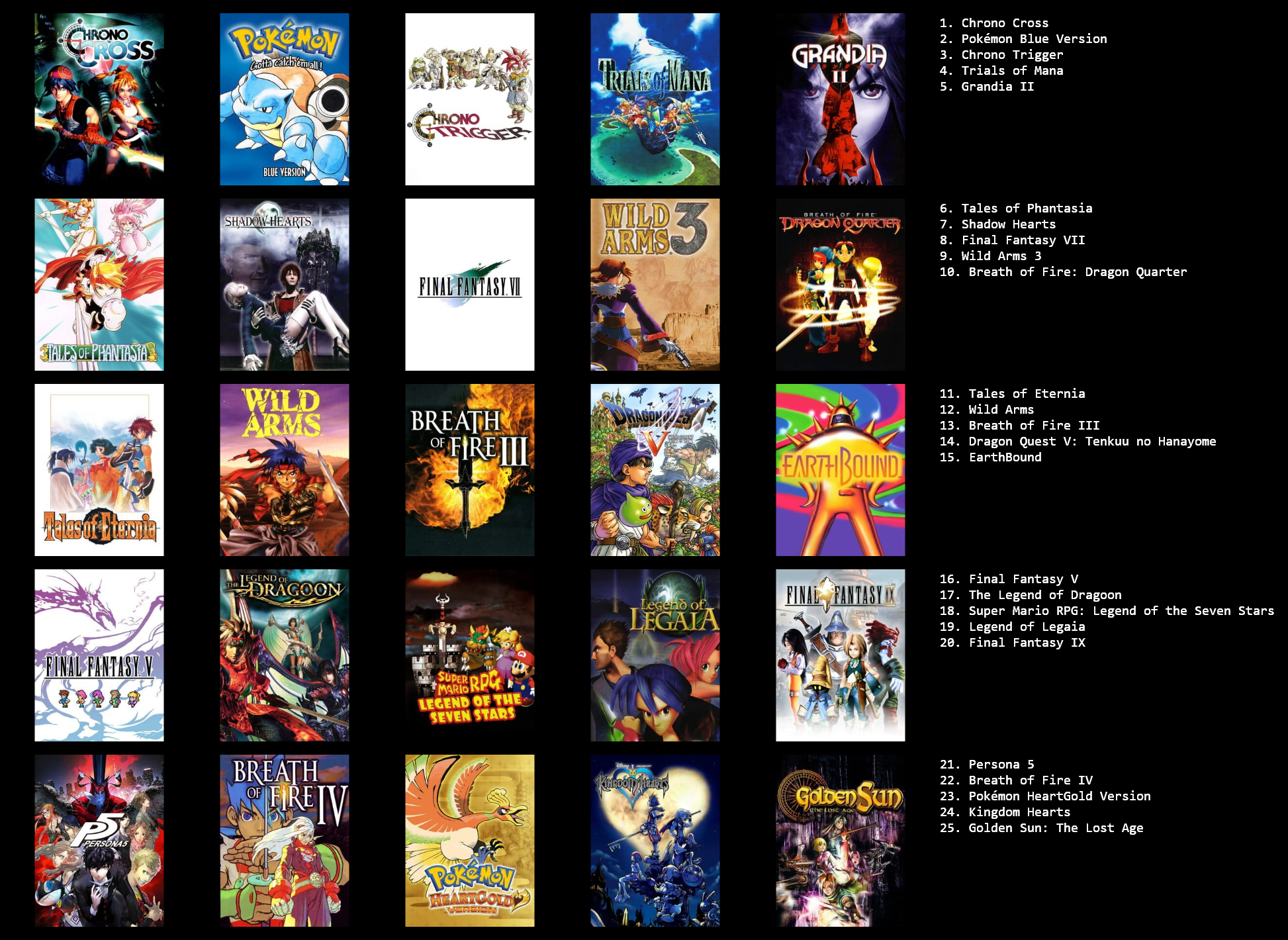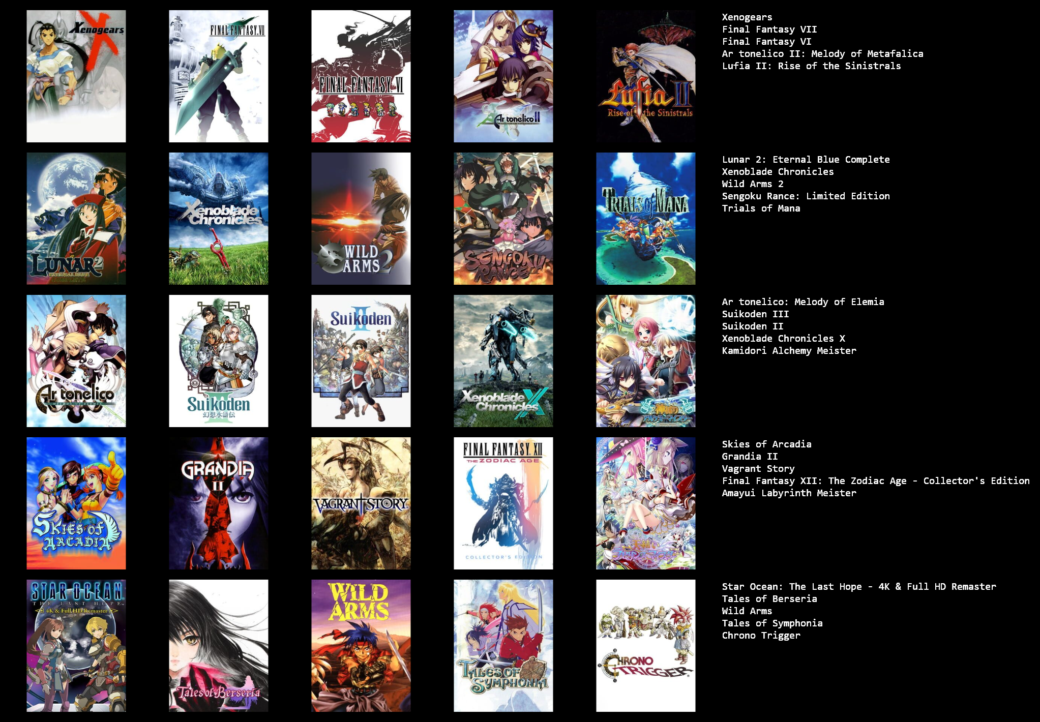 >>3932765I feel like I can only get up to 19/25 games, I could fill in the last 6 slots with jrpgs, but not jrpgs that I actually like enough to feel like it matters, like the seven final fantasies I didn't really like that much.I need to play the mother series, I think I should like at least 2 of those, maybe all 3.Going by other's 5x5s, maybe giving another chance to Legend of Mana, Dragon Quest games & Breath of Fire games, I dropped them when I last tried them though.Radiata stories and shadow heart I should probably play too.