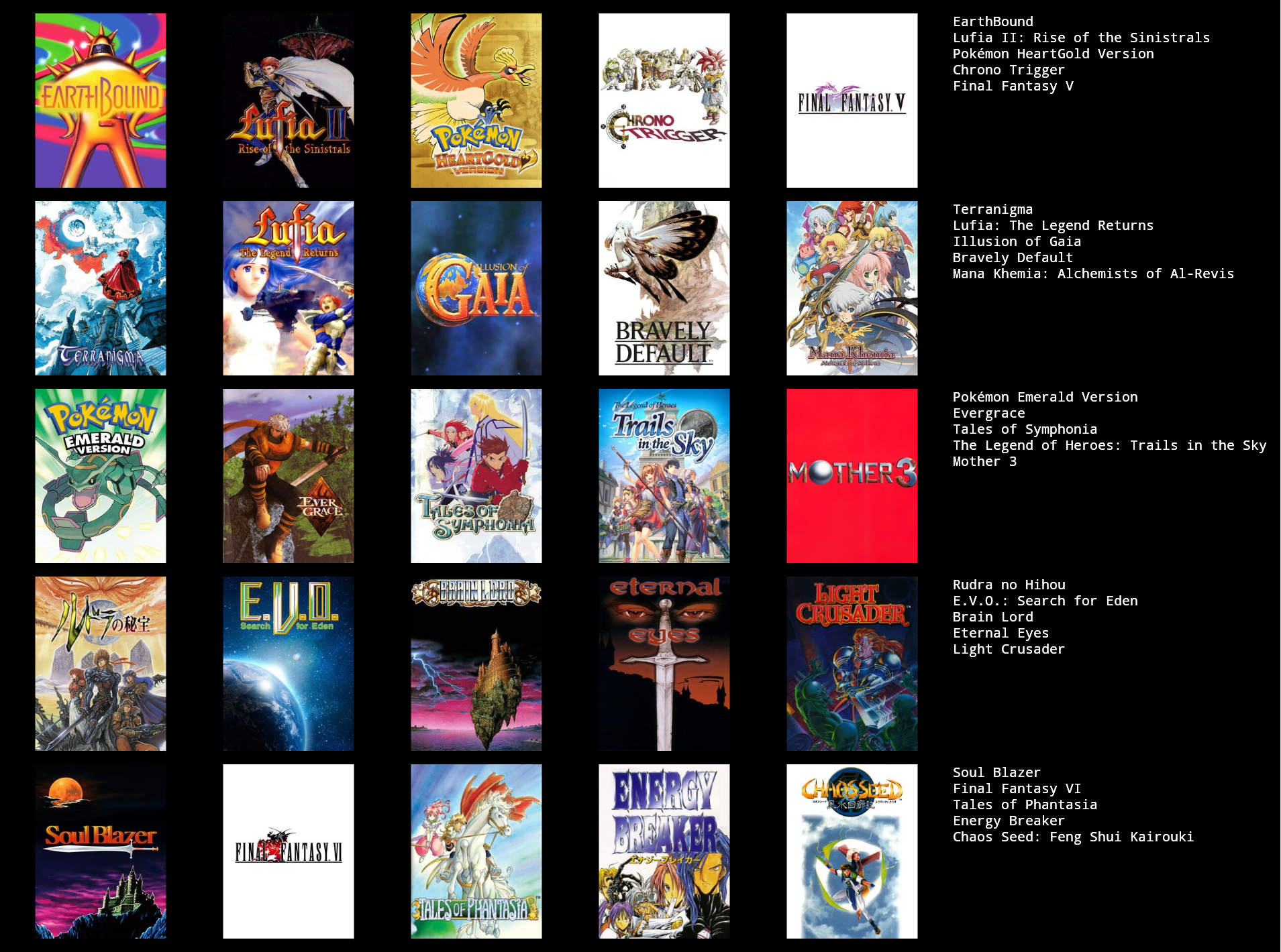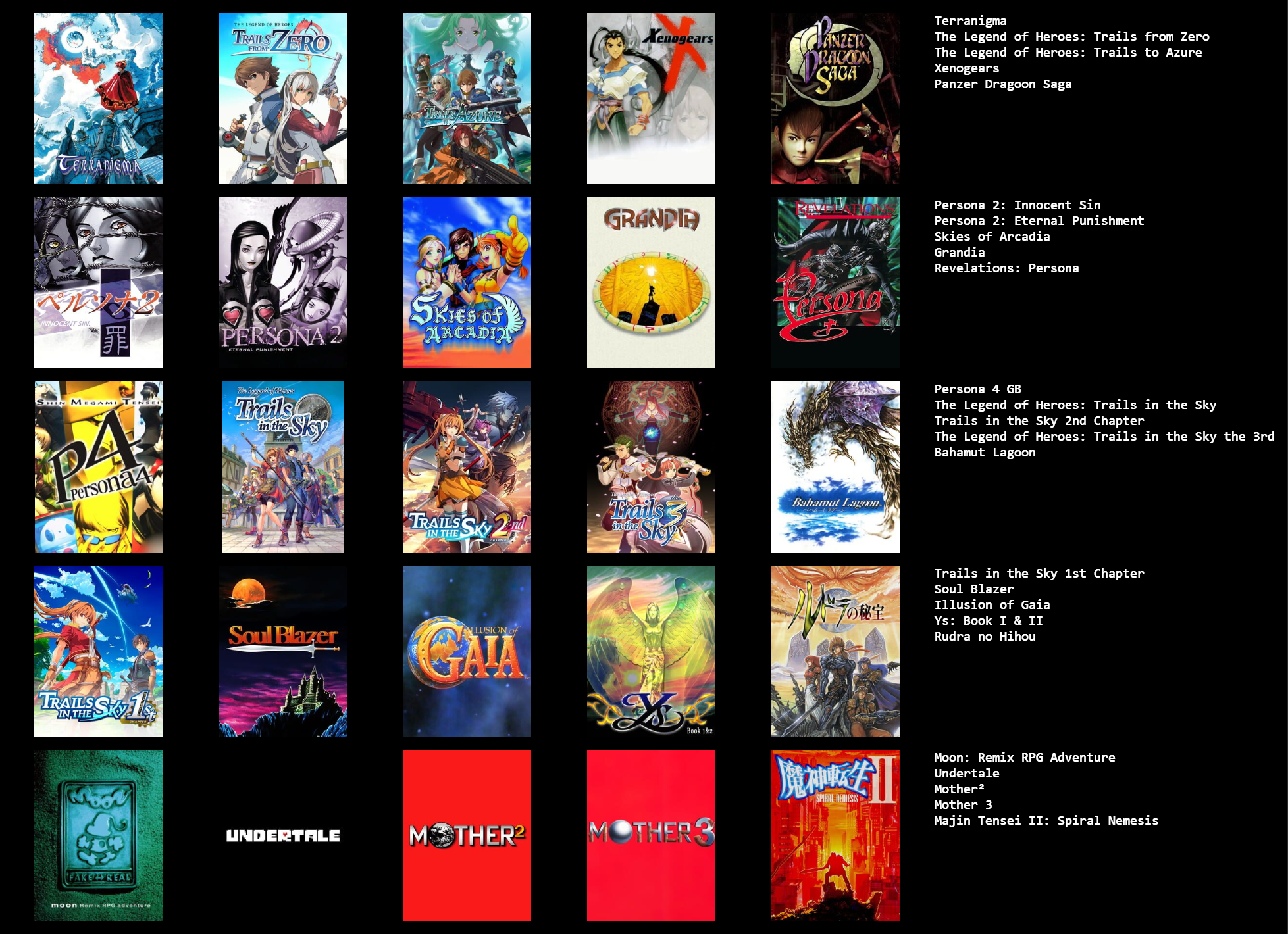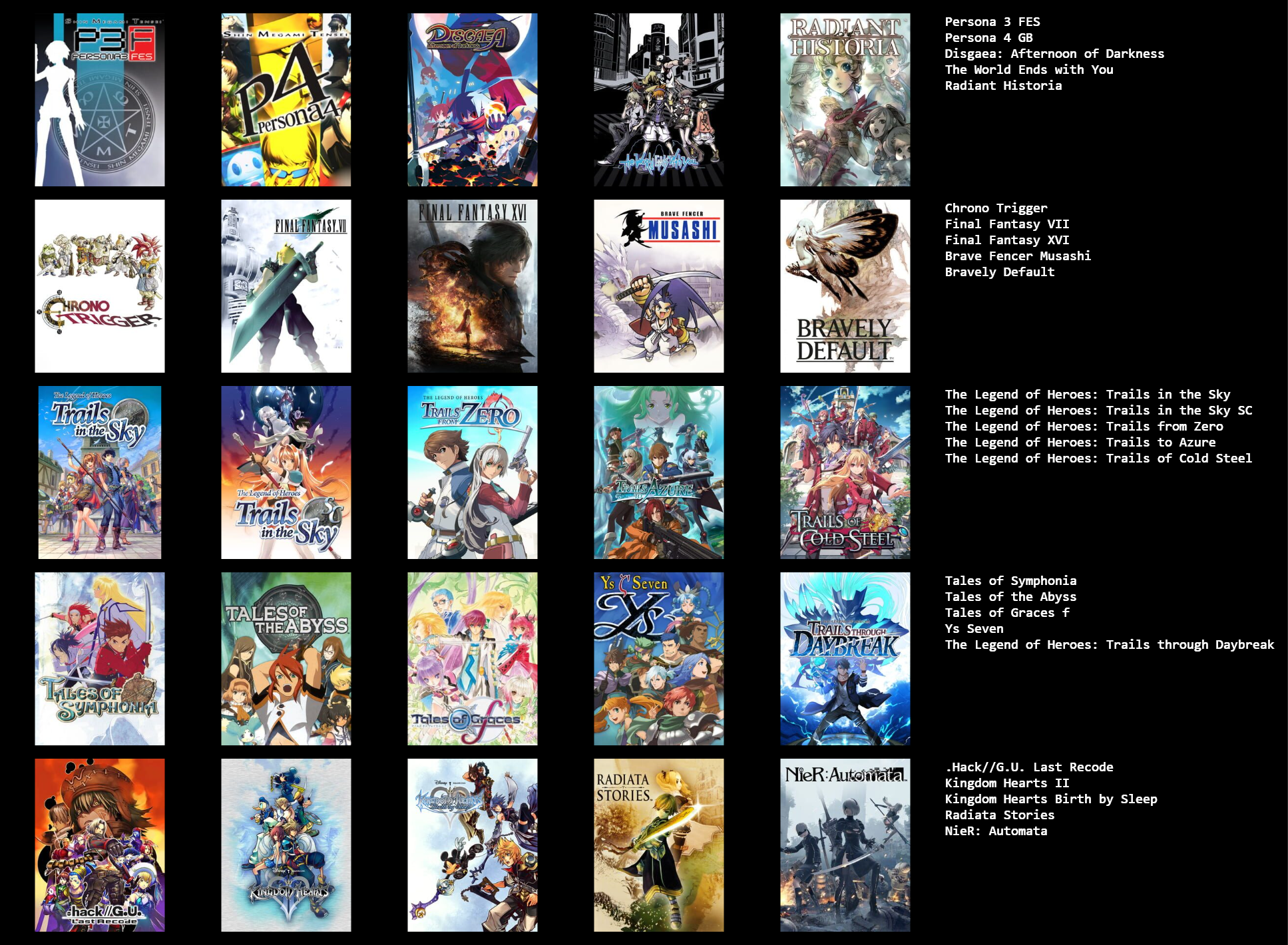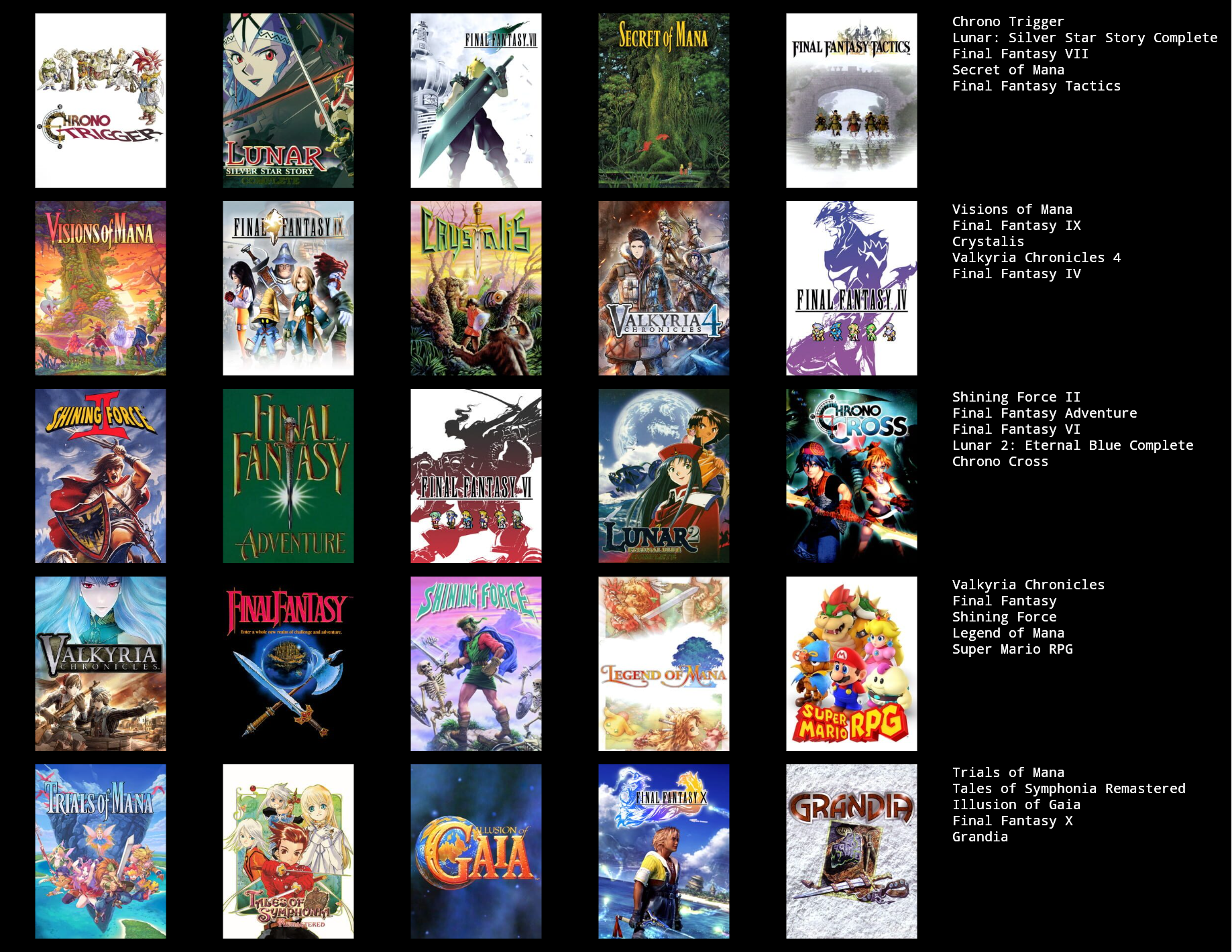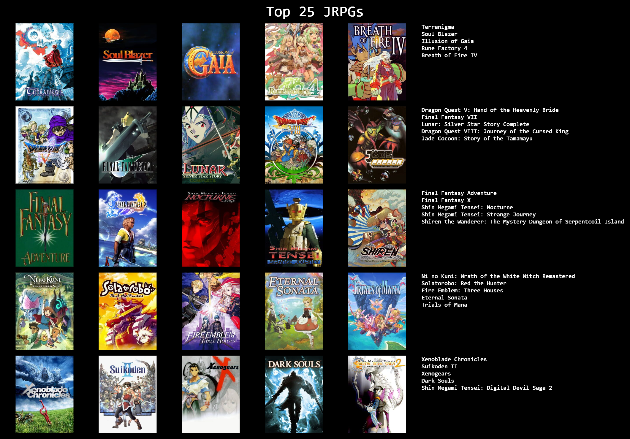 >>3932765I feel like I can only get up to 19/25 games, I could fill in the last 6 slots with jrpgs, but not jrpgs that I actually like enough to feel like it matters, like the seven final fantasies I didn't really like that much.I need to play the mother series, I think I should like at least 2 of those, maybe all 3.Going by other's 5x5s, maybe giving another chance to Legend of Mana, Dragon Quest games & Breath of Fire games, I dropped them when I last tried them though.Radiata stories and shadow heart I should probably play too.